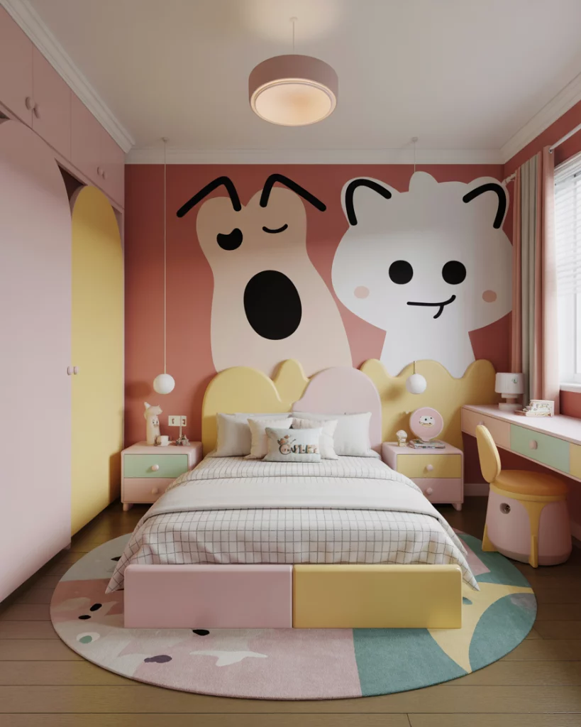 Playful kids want something creative—rooms themed after games like Stray or Toca Boca. These designs use bright murals, multi-colored furniture, and whimsical storage to create a fun scene. It’s not just décor—it’s an immersive experience that lets kids feel like they’re living in their favorite game. Parents can soften the wild colors with neutral or blue details to avoid overstimulation. This idea fits both toddlers and older children.