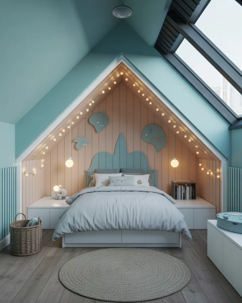 A converted attic is a dream for many families, often creating a sense of privacy and adventure. With slanted ceilings, it’s perfect for a small 2 setup or even a shared corner. Using soft blue tones and neutral woods, you can craft a cozy space that feels like a hideout. For older kids, add a reading nook or study desk; for girls children, playful fairy lights make it magical. Smart storage under slanted walls keeps things tidy.
