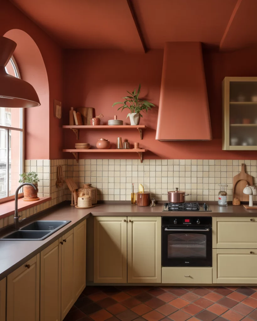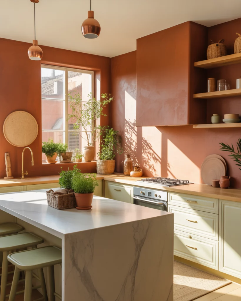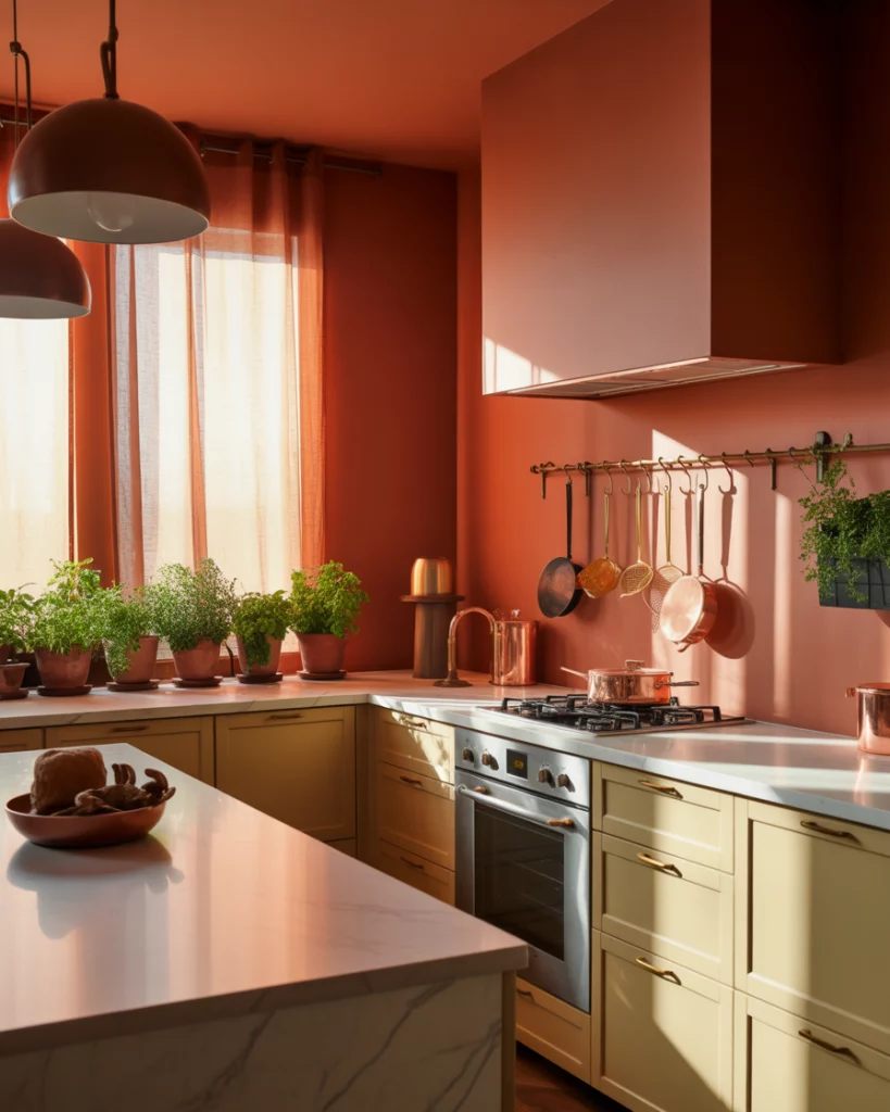 Warm, amber-inspired palettes are becoming trendy because they blend cozy comfort with modern elegance. This idea works beautifully in open-plan homes, pairing soft terracotta with creamy neutrals for palette ideas, gentle schemes, and harmonious combination updates. These tones are especially effective as ideas for walls or backsplashes, adding a subtle glow without feeling overpowering.