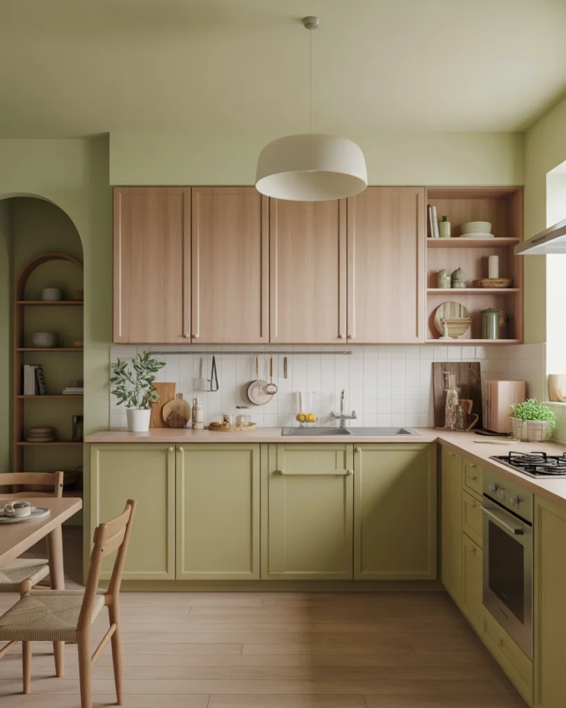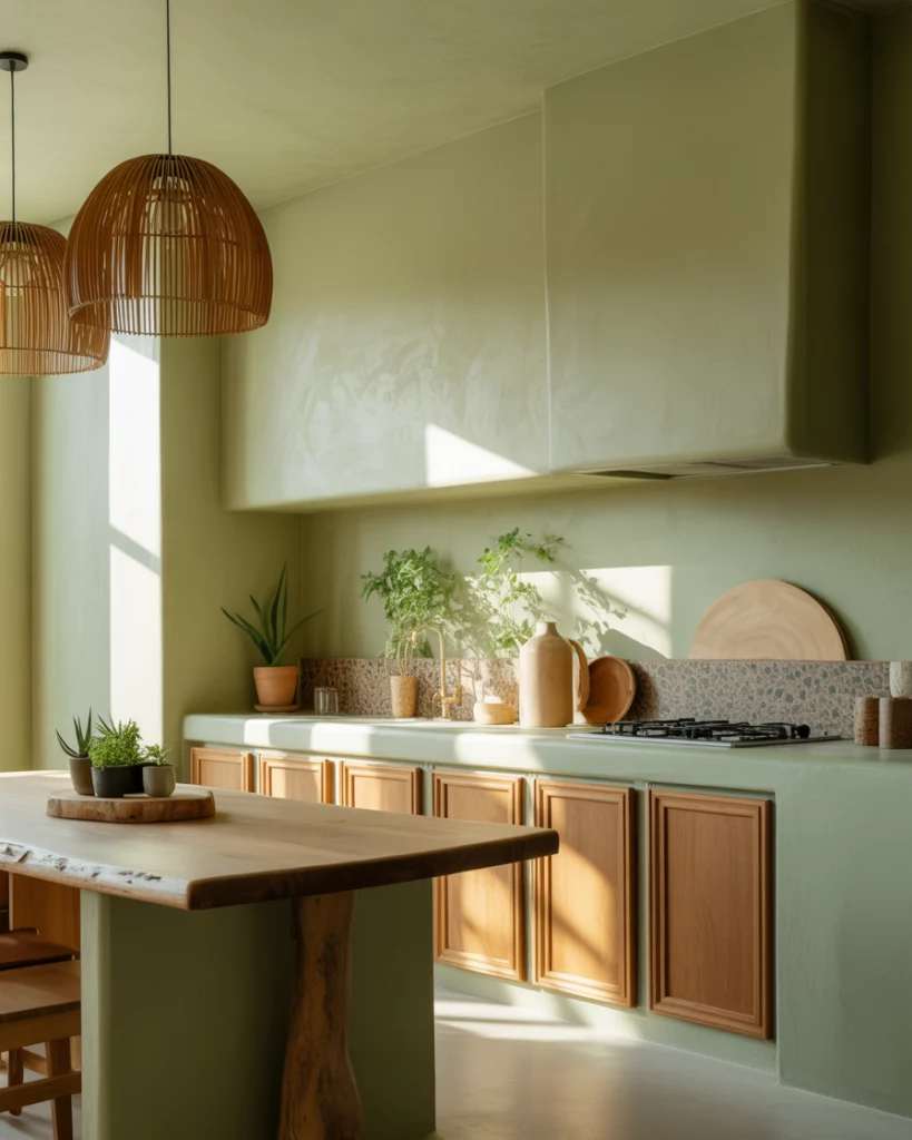 Soft leafy greens continue to dominate trendy kitchen schemes, especially when used for walls or pantry doors. They create grounding atmospheres and feel timeless next to stone, rattan, or ceramic pieces. Designers love these tones for their ability to bridge modern and rustic combos, offering adaptable, calming palettes.