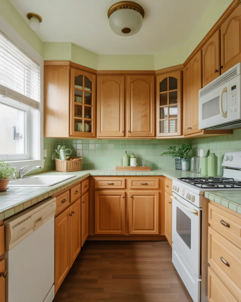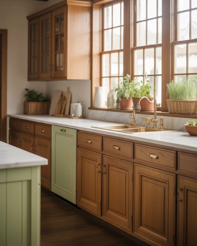 Sage green paired with oak cabinets forms one of the most soothing schemes with oak cabinets. Designers say this combination echoes calm landscapes, making it ideal for homes that lean natural or modern-organic. This style works in kitchens where homeowners want warmth, subtle color, and approachable palette ideas rooted in nature.