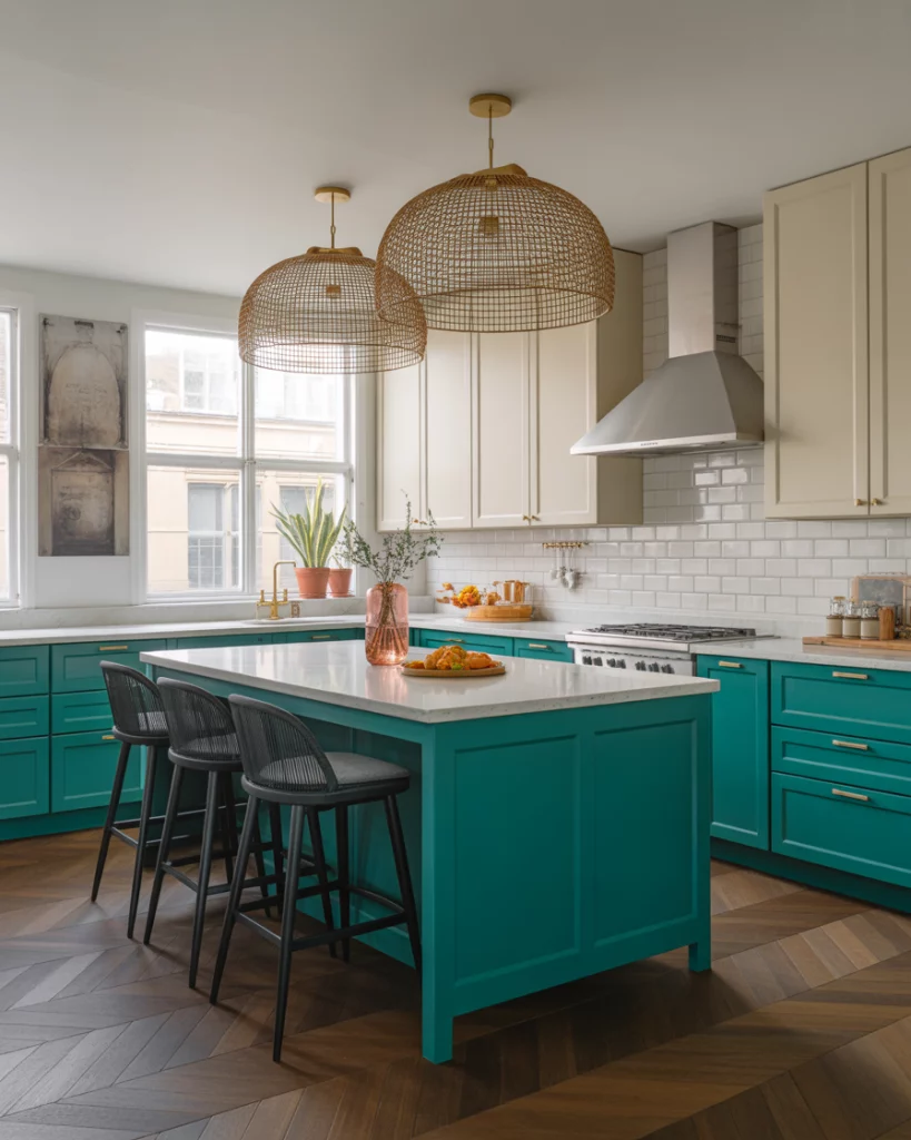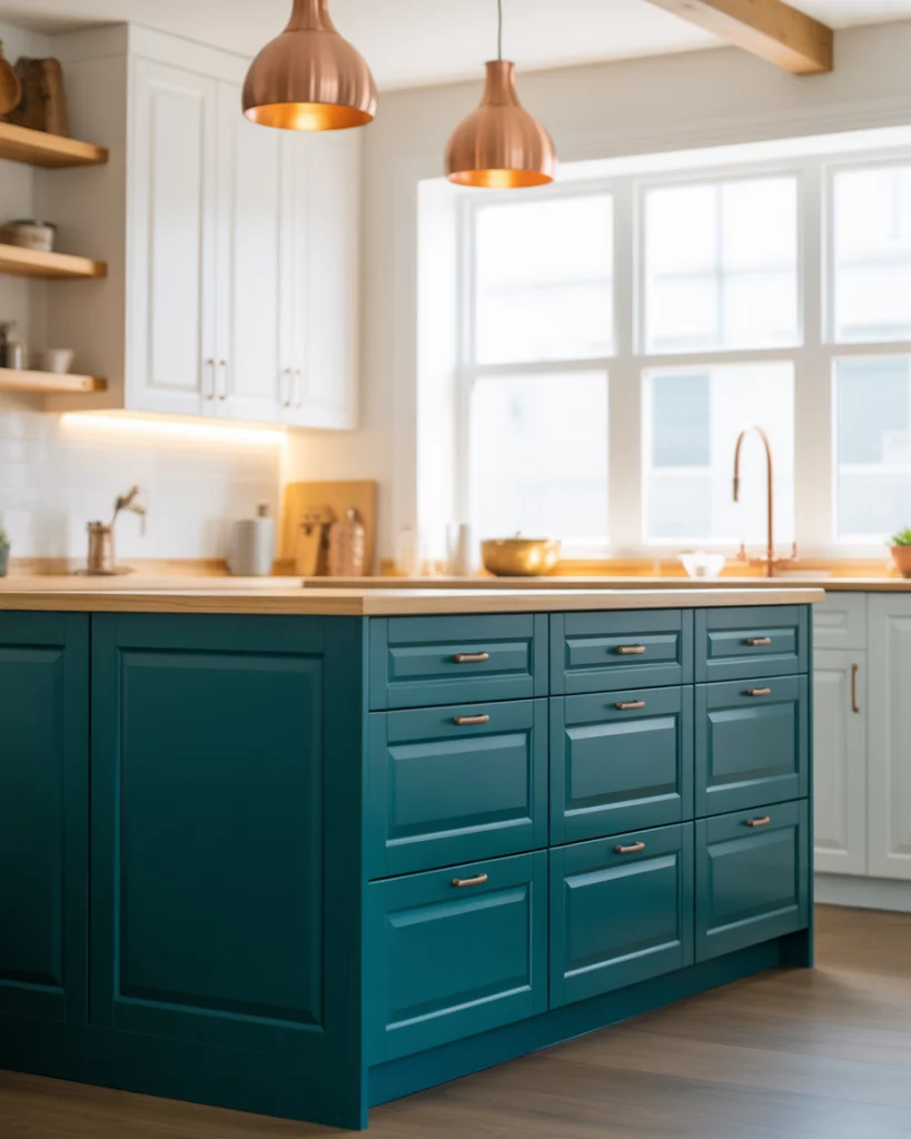 Teal remains one of the most expressive bold choices for 2026, embraced by adventurous decorators who love vibrant palette direction. Whether on an island base or pantry doors, teal adds dramatic flair while pairing surprisingly well with warm metals and natural textures. This approach suits transitional homes craving color-forward scheme ideas.