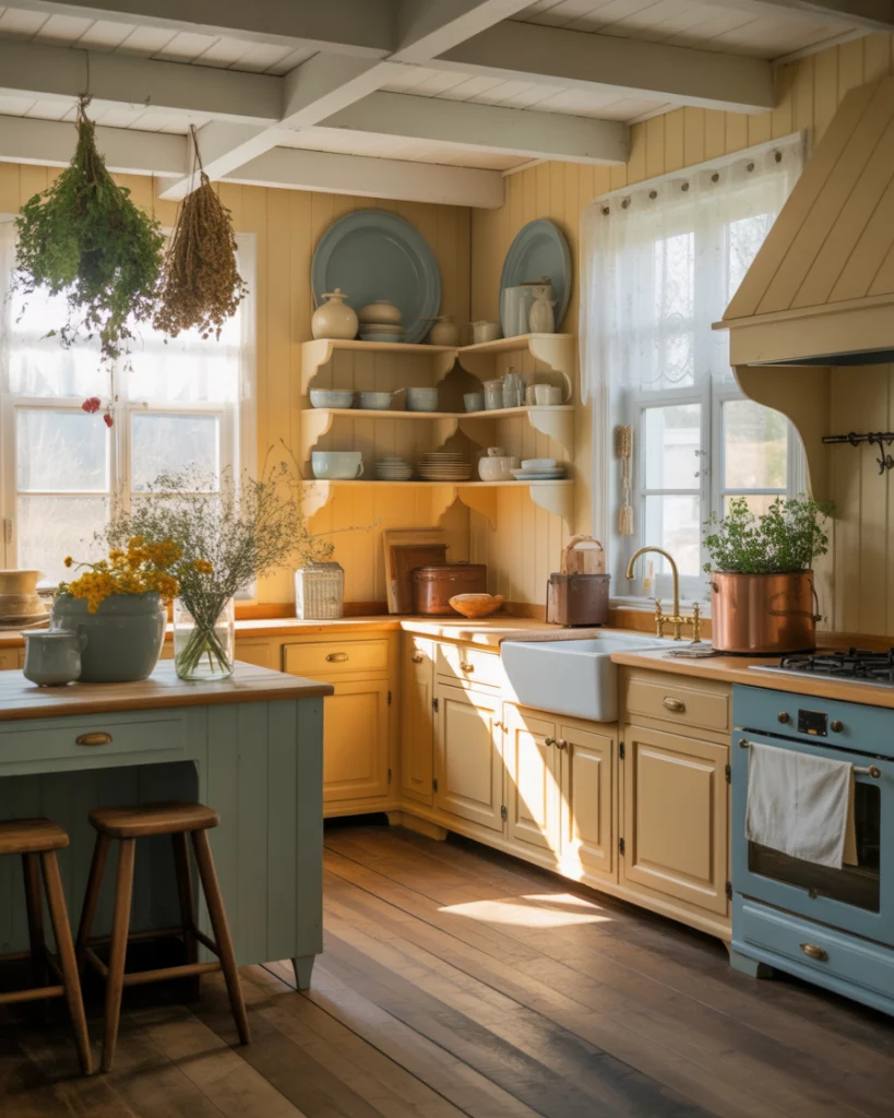 Blending buttercream yellows with country blues creates nostalgic yet trendy themes. This combination recalls classic Americana but feels updated through matte finishes and modern tile. Homeowners who enjoy cozy, heritage-inspired kitchens often choose this direction for its cheerful palette ideas and adaptable schemes for paint options.