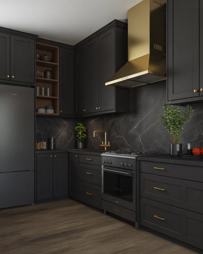 For dramatic impact, jet black paired with warm brass delivers one of 2026’s strongest combos. This scheme is ideal for urban lofts or modern homes seeking bold contrast. Despite its intensity, the look remains inviting when balanced with wood tones or soft lighting—offering some of the best high-impact scheme ideas.