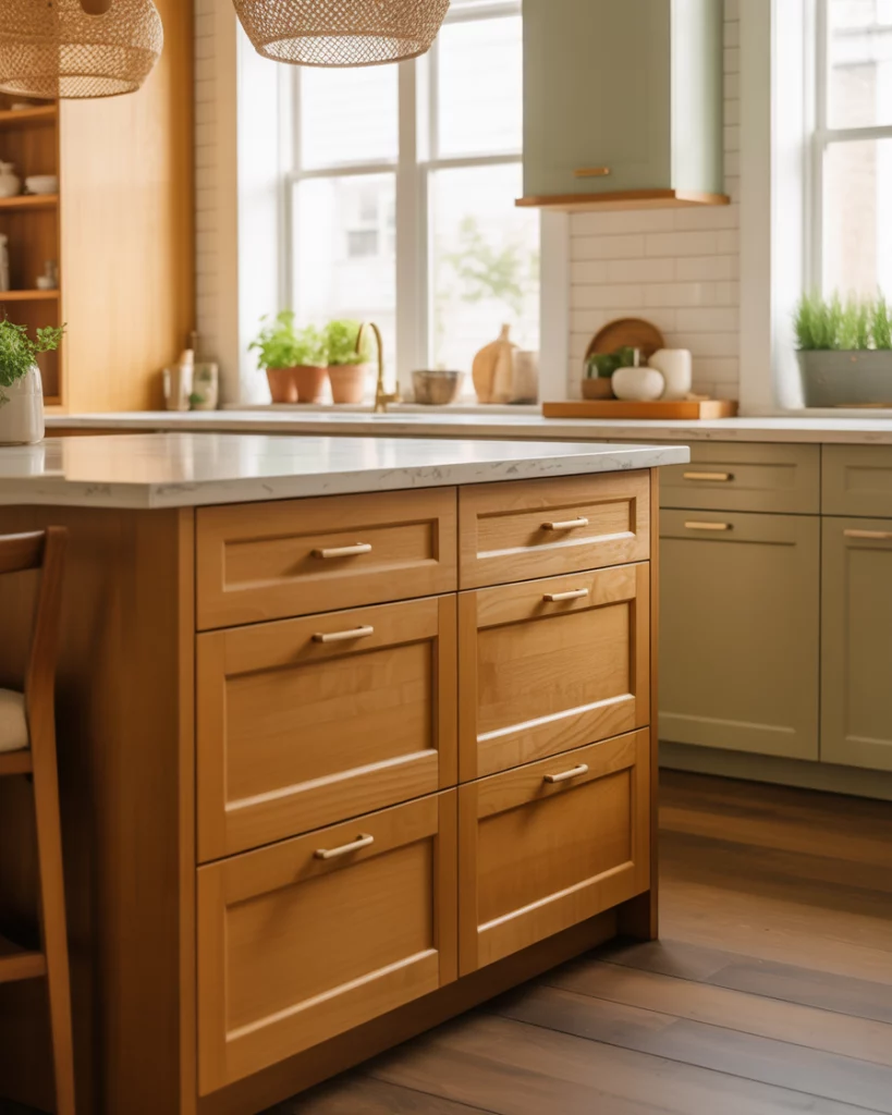 Honey-toned maple is making a comeback, offering uplifting color and natural texture in schemes that feel both trendy and timeless. It pairs wonderfully with muted greens, creams, and warm grays—some of the best combination ideas for approachable kitchen updates. This look suits homeowners who love organic palette direction with subtle cheerfulness.