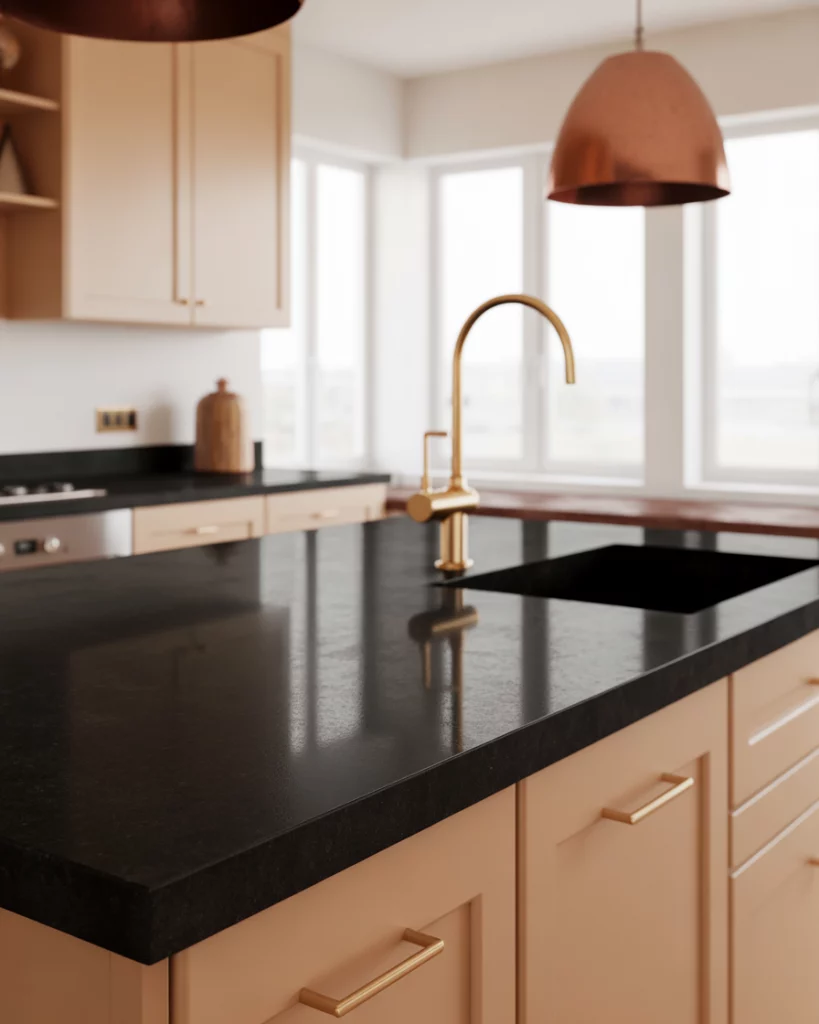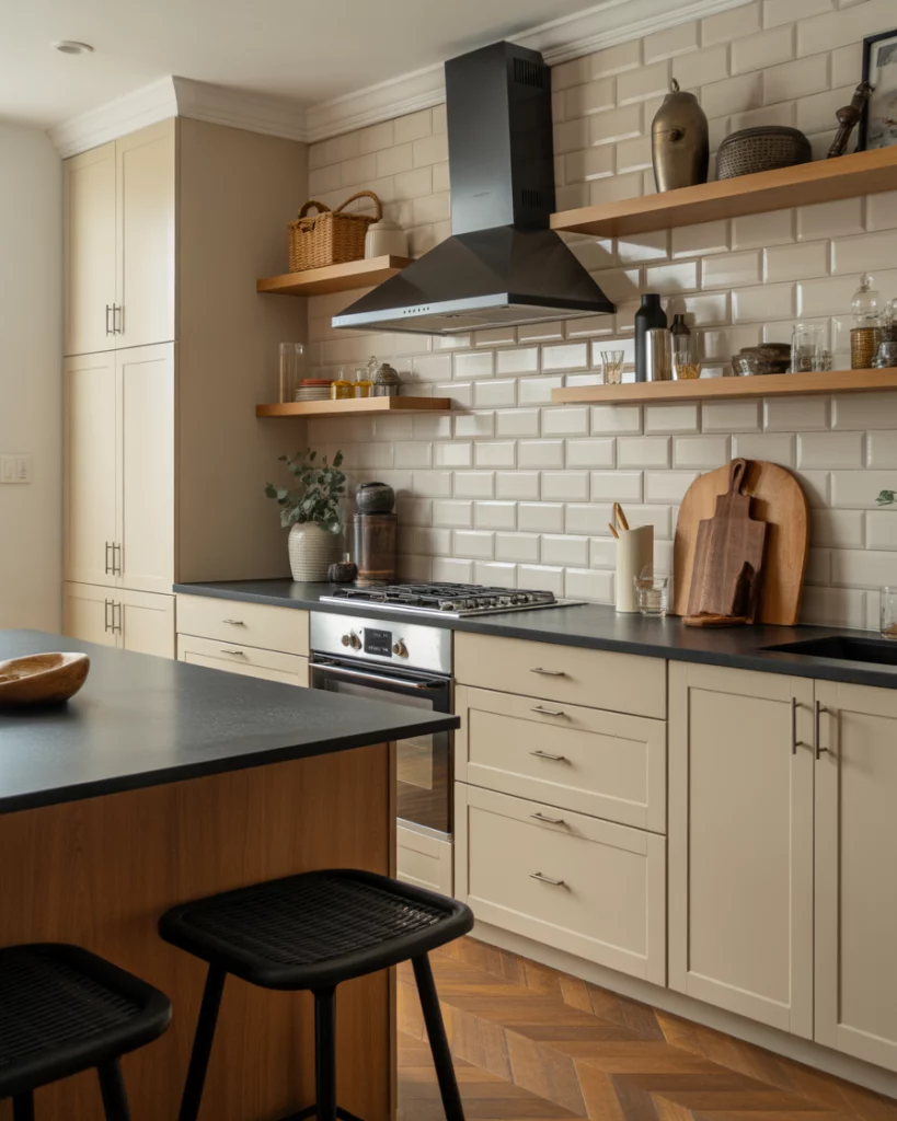 A black countertoppaired with light cabinetry creates one of 2026’s most striking schemes. The contrast adds sophistication without sacrificing warmth, especially alongside brass hardware or wood shelving. It’s a practical choice too—designers praise its durability and forgiving surface—fitting well with both traditional and contemporary themes.