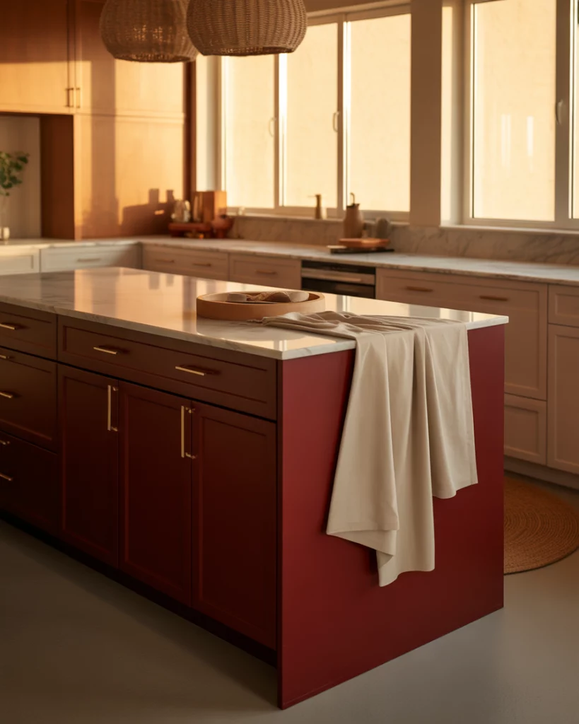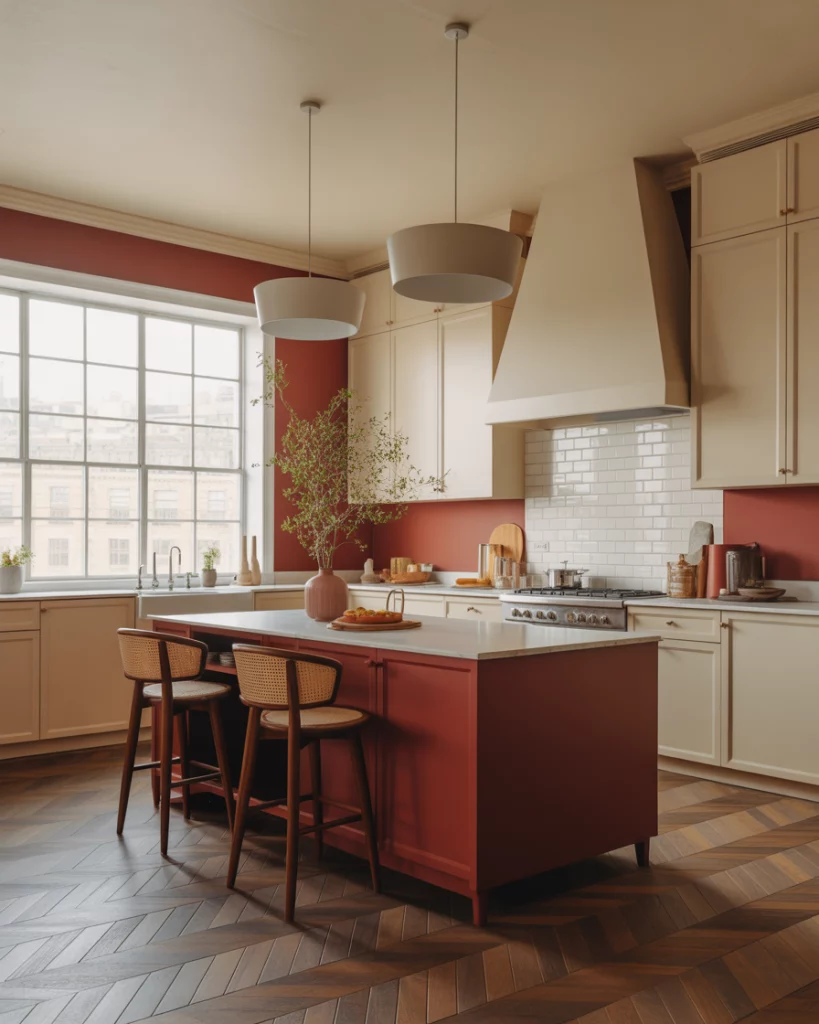 Deep red tones, long celebrated in European farmhouses, are back in American kitchens. They introduce bold character and create dynamic combinations of ideas with cream, slate, or natural woods. This palette adds drama without harshness, making it a favorite for accent islands, painted cabinets, or warm-scheme paint ideas.