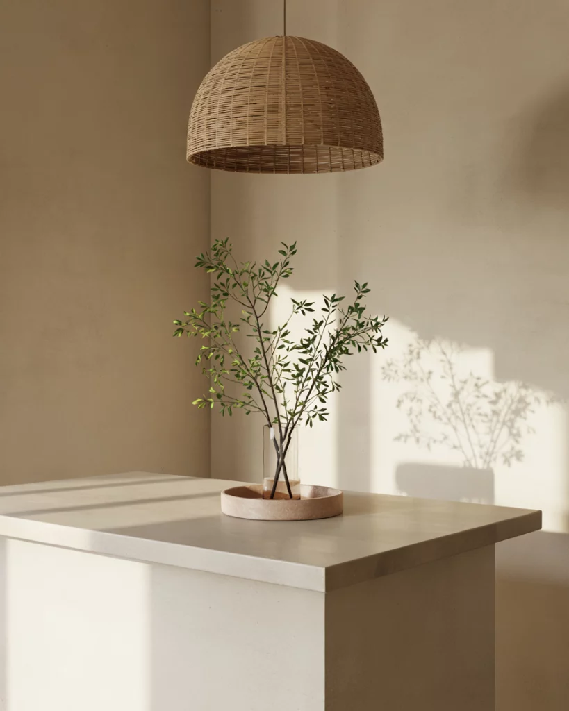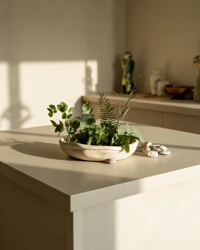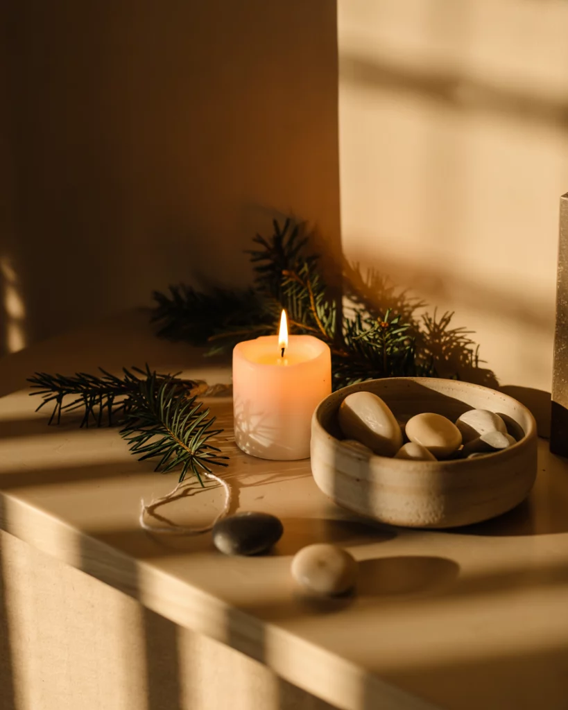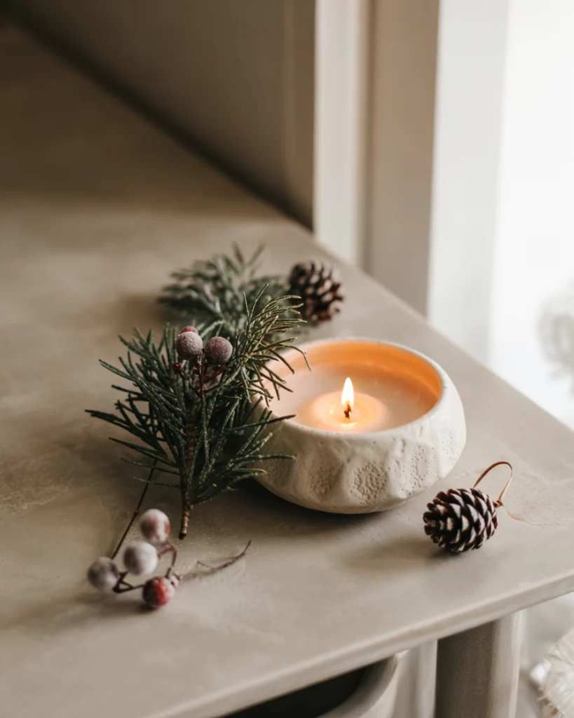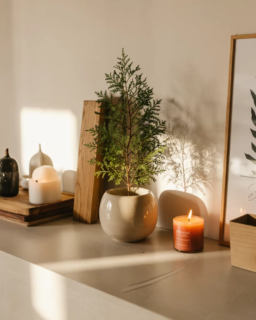 Holiday decor doesn’t need to take over the entire counter. A minimal Christmas setup—like a small spruce branch, stone bowl, and one simple ornament—keeps things sophisticated. Add a cozy candle for a soft December glow without overwhelming your prep space. A single sprig from a tree lot or a grocery-store bundle of greens is often enough. Spend less on themed decor and more on quality candles that last the whole season.