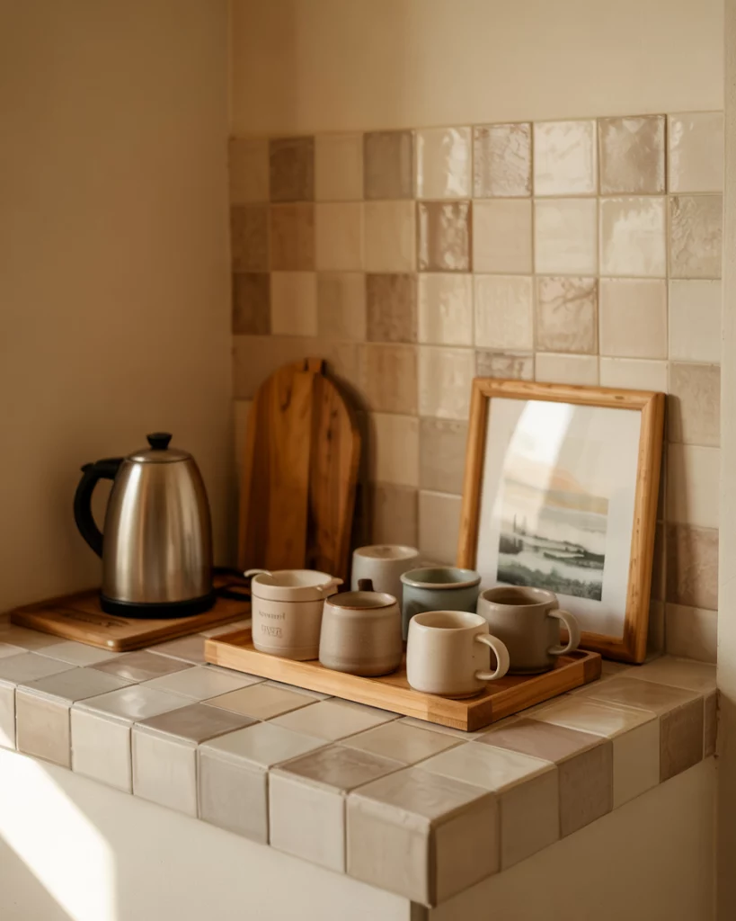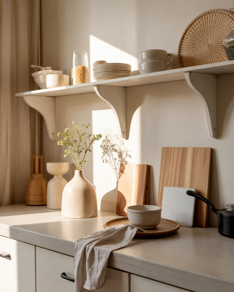 A small apartment kitchen benefits from calm neutrals and airy objects that don’t overwhelm the space. A slim vase, a textured bowl, and soft linen beside your apartment sink create balance. Add a touch of aesthetic charm with gentle shapes and a white accent to keep everything bright. In tight spaces, height variation is your best friend. One tall piece, one medium, one low—this rhythm adds polish without using extra footprint.