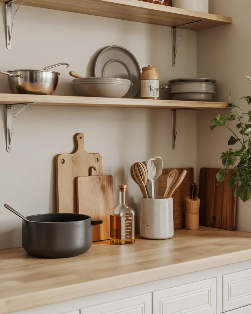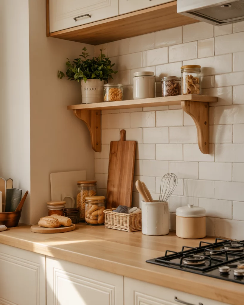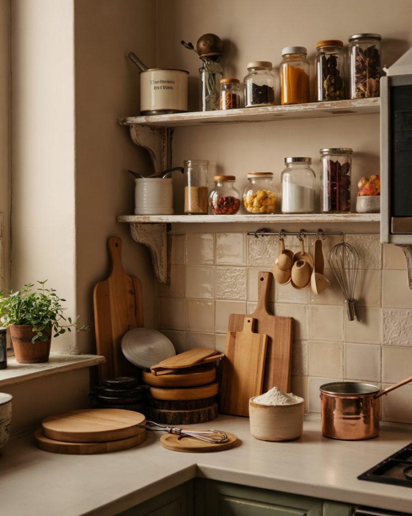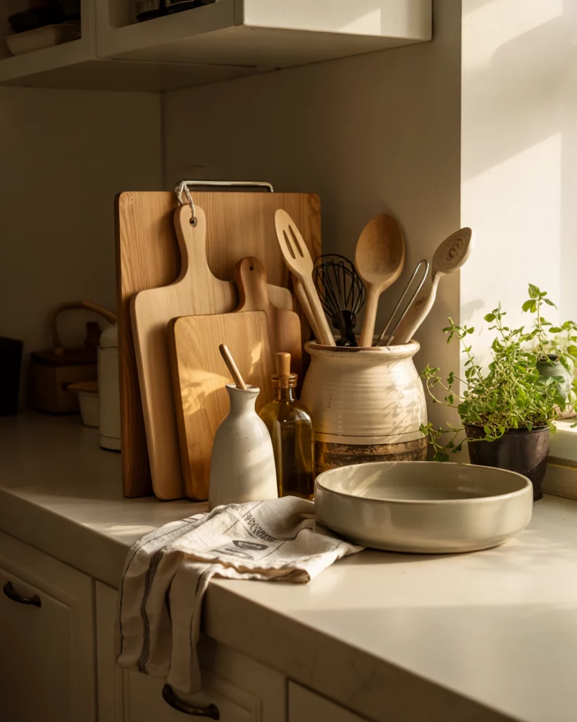 Small corners can become purposeful stations with just a few pieces. A stack of boards, a petite corner jar, and a cute whisk cup set the tone. Add one simple touch—like a small tray—to keep tools contained and visually cohesive. Real homeowner behavior—people naturally drop tools in the same spot after cooking. Turning that habit into a designated mini-station makes the kitchen feel organized without forcing new routines.