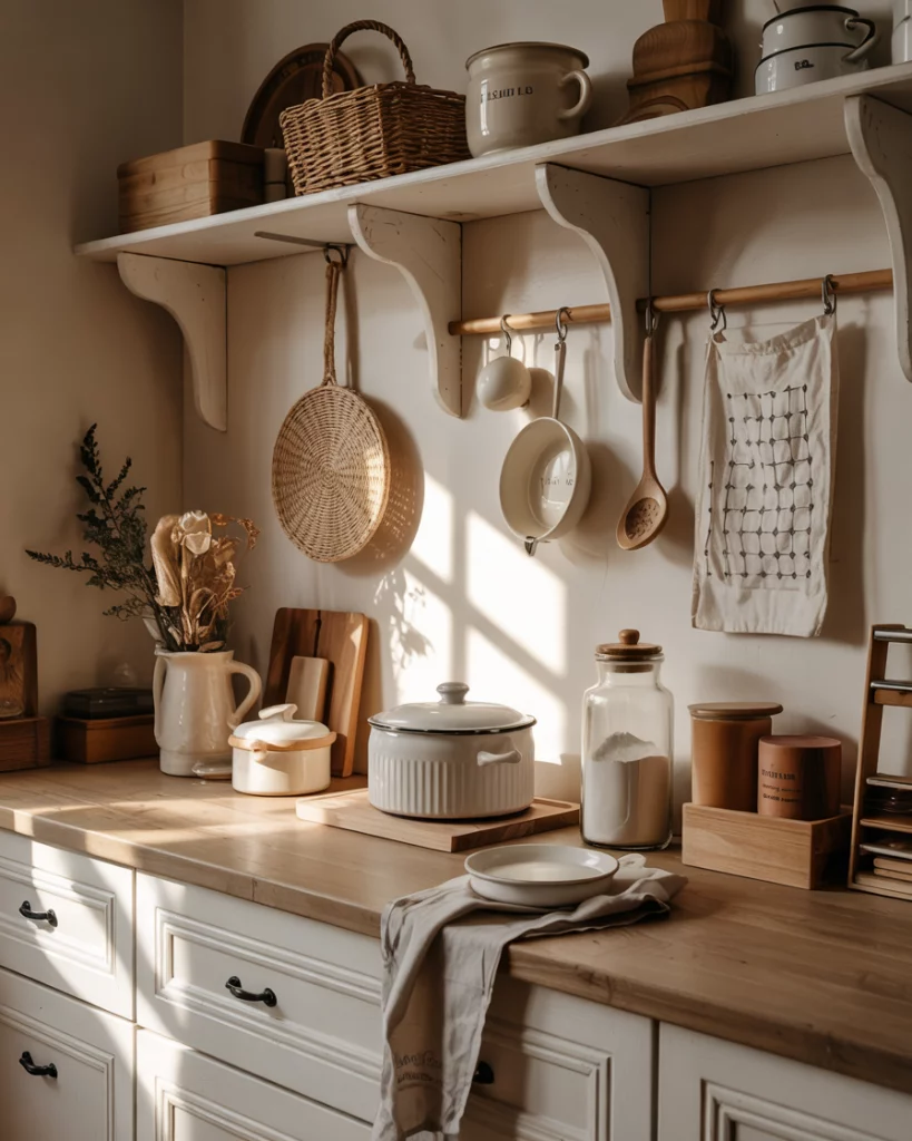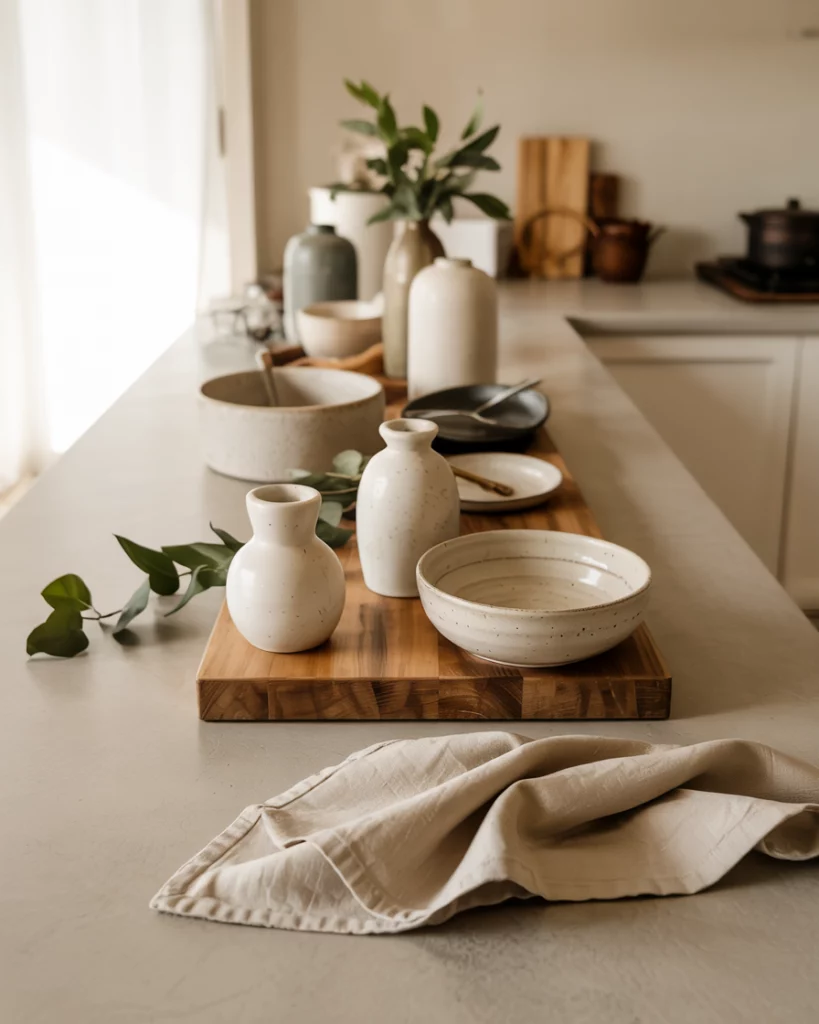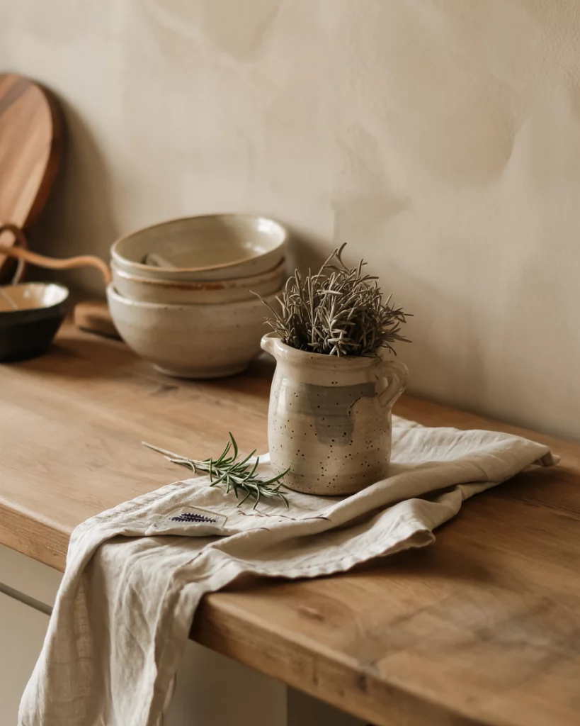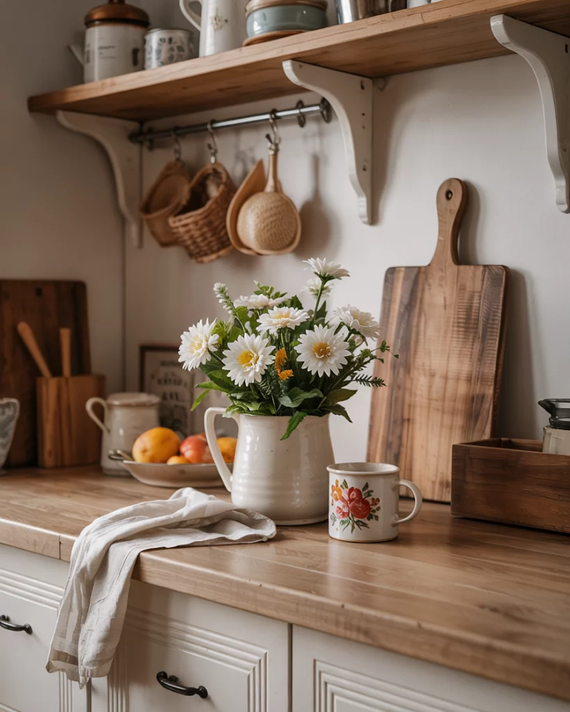 Blending rustic charm with streamlined design creates a timeless look. A wood board, a petite cottage crock, and a slim modern vase form a harmonious trio. Add one creative accessory detail—like a textured towel—for character. The key to mixing modern and cottage is contrast: pair smooth shapes with handmade textures. This prevents the space from leaning too rustic or too sleek.