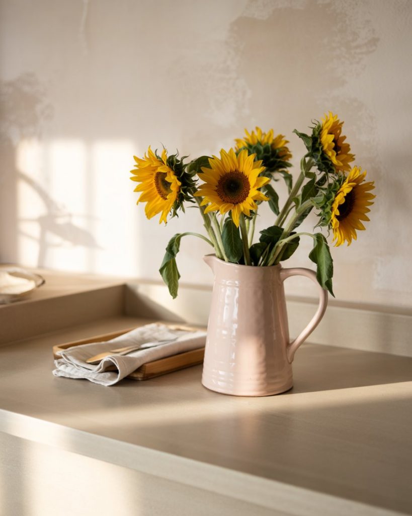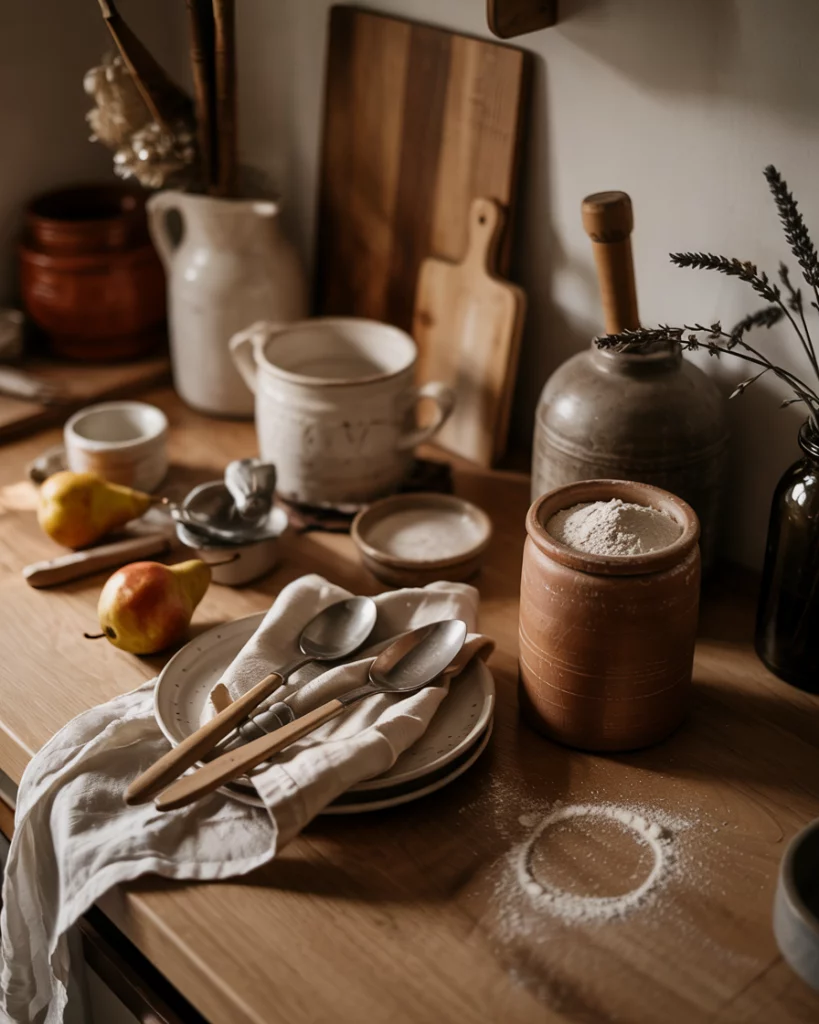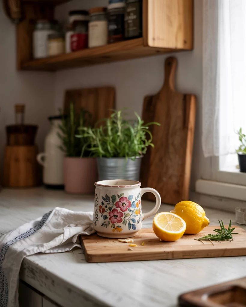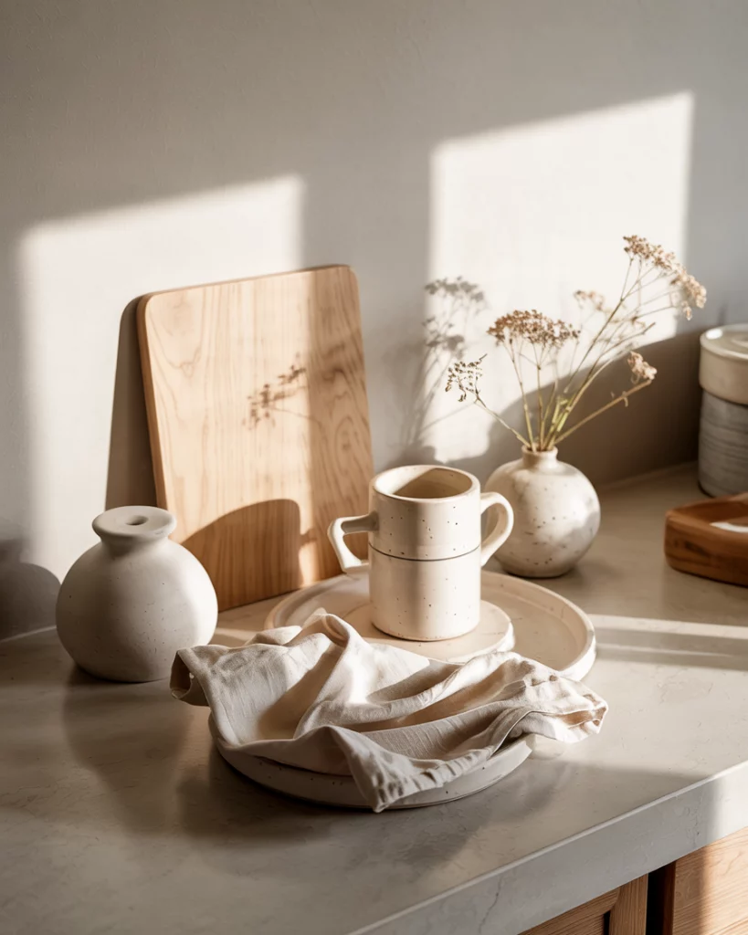 Blending rustic charm with streamlined design creates a timeless look. A wood board, a petite cottage crock, and a slim modern vase form a harmonious trio. Add one creative accessory detail—like a textured towel—for character. The key to mixing modern and cottage is contrast: pair smooth shapes with handmade textures. This prevents the space from leaning too rustic or too sleek.