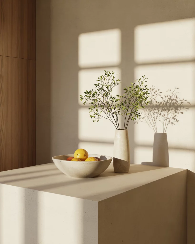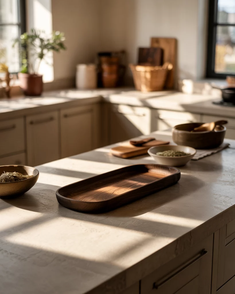 For extended counters, add gentle movement with spaced objects. A slim vase, a long cutting board, and a minimalist bowl create a clean direction. Include one piece of the same countertop for subtle texture. Avoid placing identical objects at even intervals. Slight asymmetry keeps the look natural, not staged.