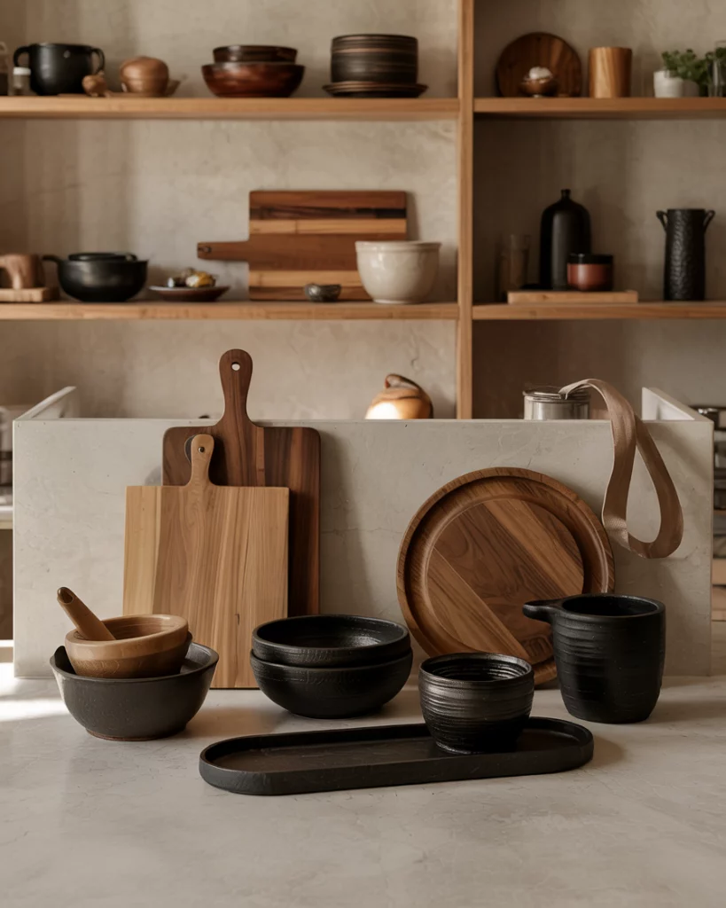 Mixing in a refined black element along with the matte wood for a volume and deeper ambiance works well. Pair a stack of cutting boards along with some slightly textured neutral grain bowls and a modern jar to give the space more of a grounded feeling. To subtly withdraw a highlight from the space, add a long tray to stretch out the space composition along with it. American lifestyle lifestyle or regional context New suburban builds have become popular dark accents, where there are bright open-plan layouts with the benefit of visual “anchors” for the additional sophistication.