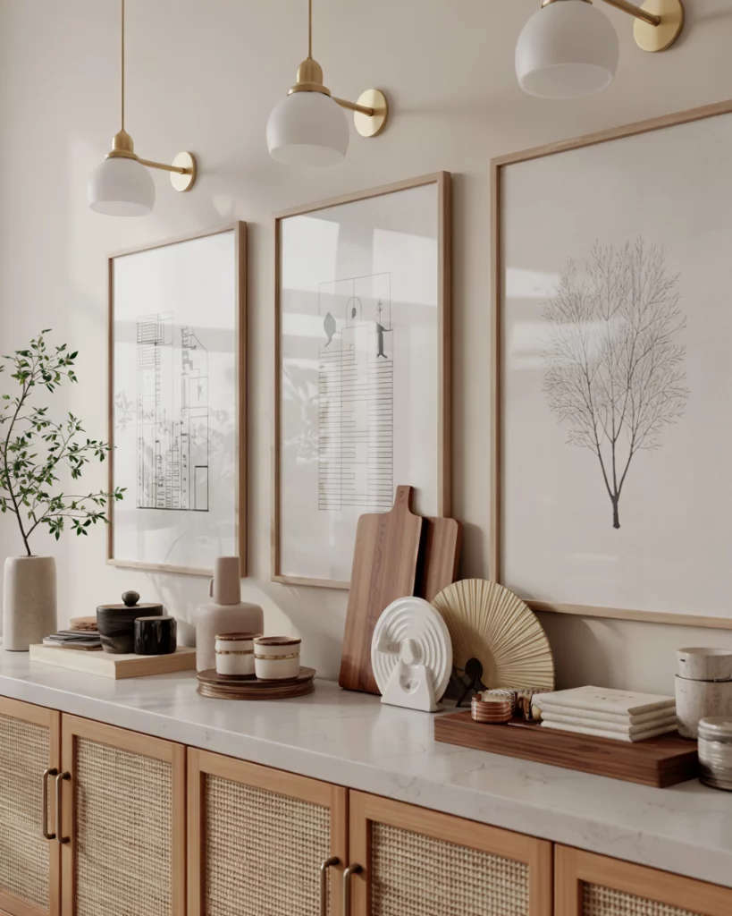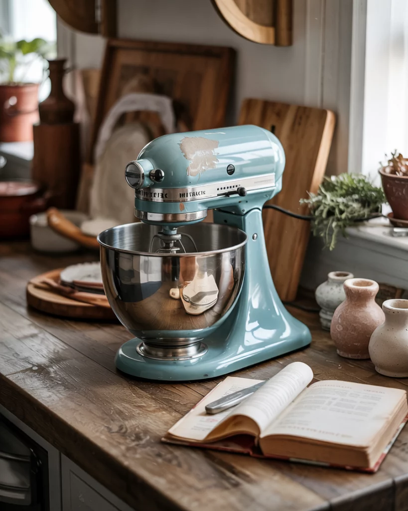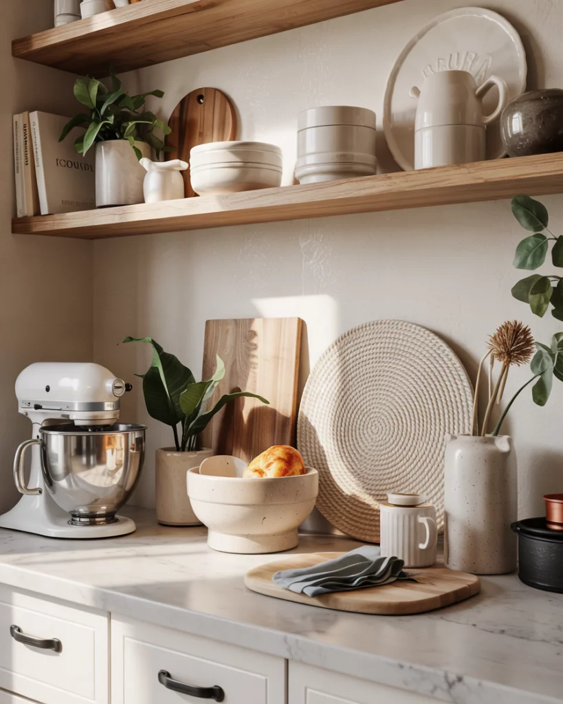 Your appliances can become decor when thoughtfully arranged. Showcase your KitchenAid mixer, a favorite cookbook, and a modern jar to tie the palette together. Add one native accessory detail—like a textured board—to soften edges. Many people leave large appliances out simply because they’re heavy. Styling around them turns a necessity into a feature instead of visual clutter.