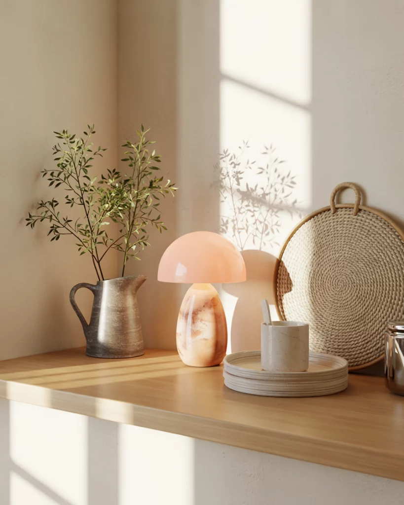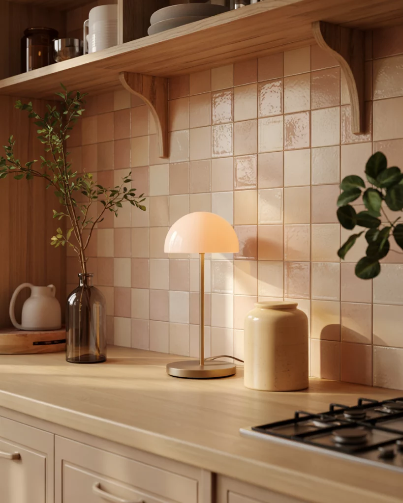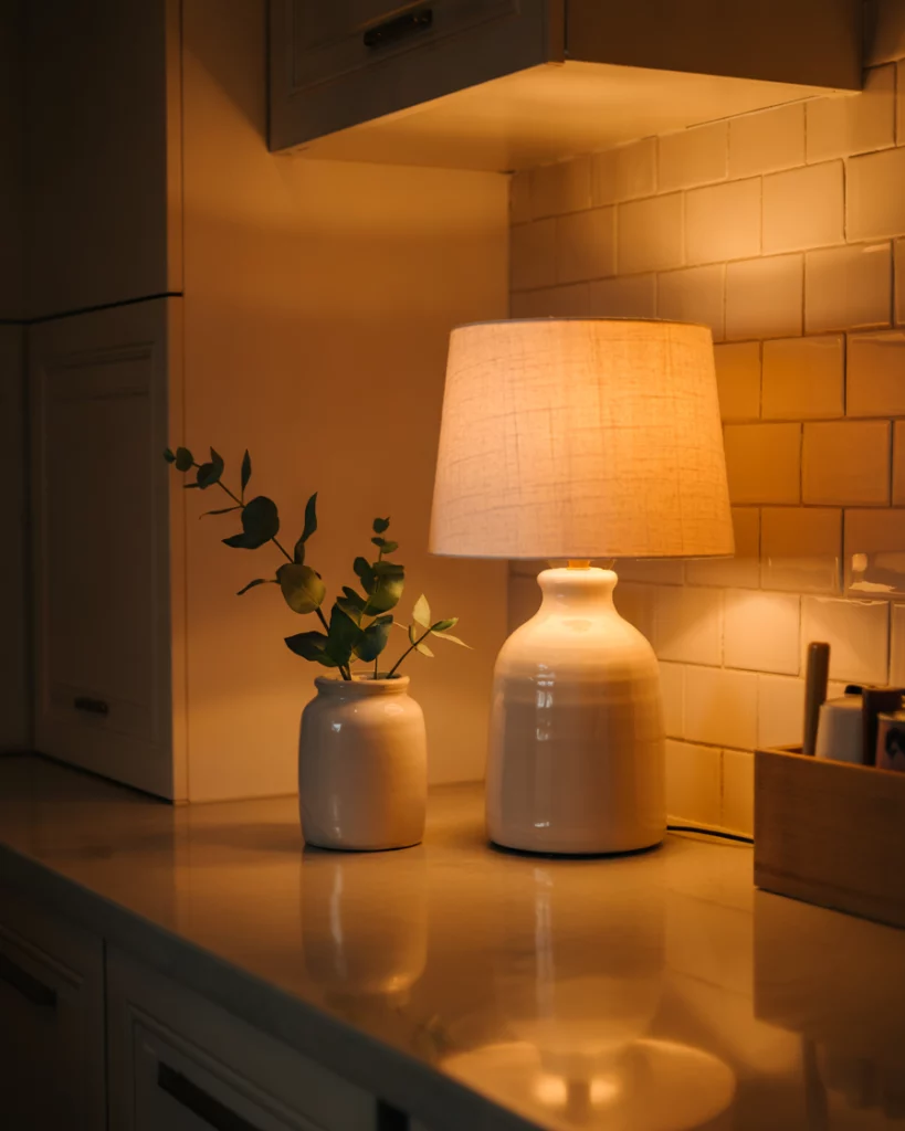 Adding a tiny counter lamp has become one of the most-loved trends. In the evenings, it adds warmth that feels deeply cozy, especially in larger kitchens. Pair it with one or two modern touches—like a matte canister or sculptural vase—to keep the look contemporary. Many U.S. homes have open kitchens connected to living spaces, so low lighting helps transition from day to evening. A lamp lets the kitchen feel like part of the cozy nighttime living zone.
