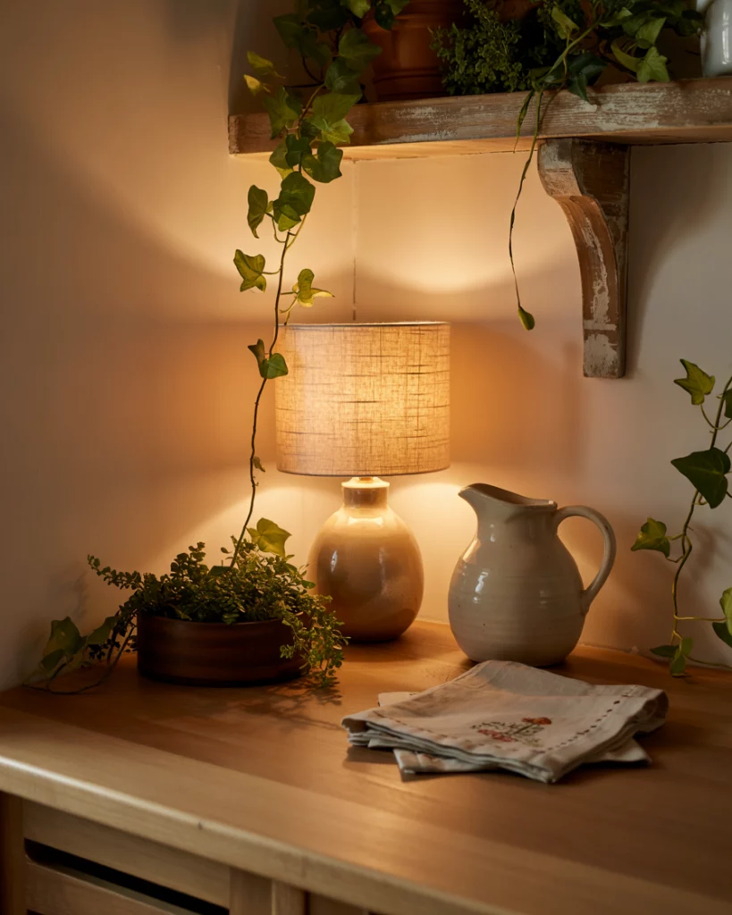 Unused corners are perfect for mini-vignettes. Try a stoneware pitcher, a corner plantlet, and a warm lamp to brighten a shadowy space. Add a subtle eating ideas twist with stacked books or textured trays. Designers often target corners first because a well-styled nook lifts the mood of the whole kitchen. It’s an easy, high-impact zone.