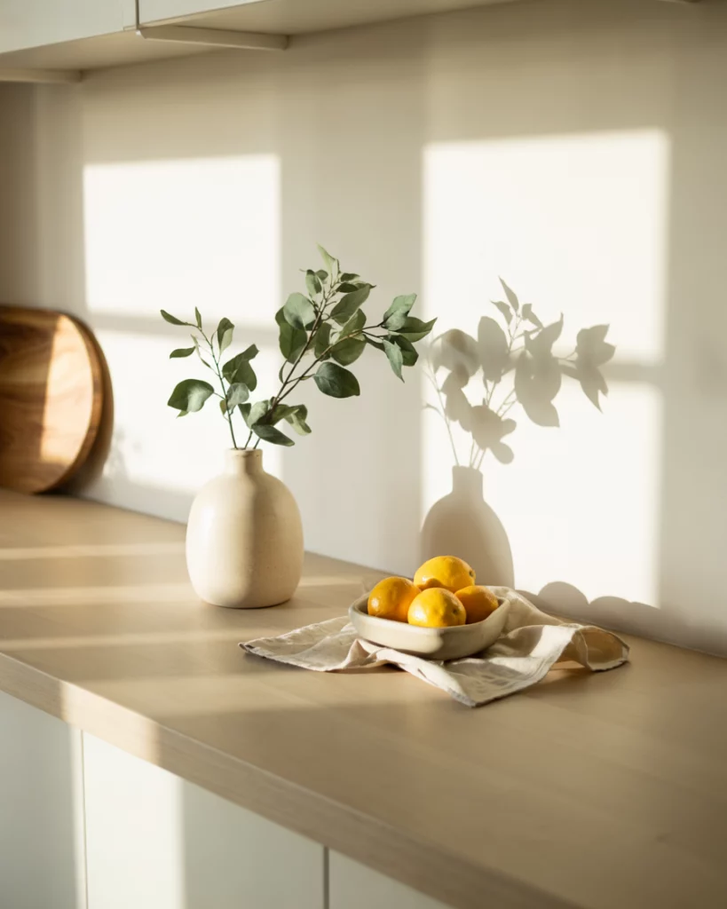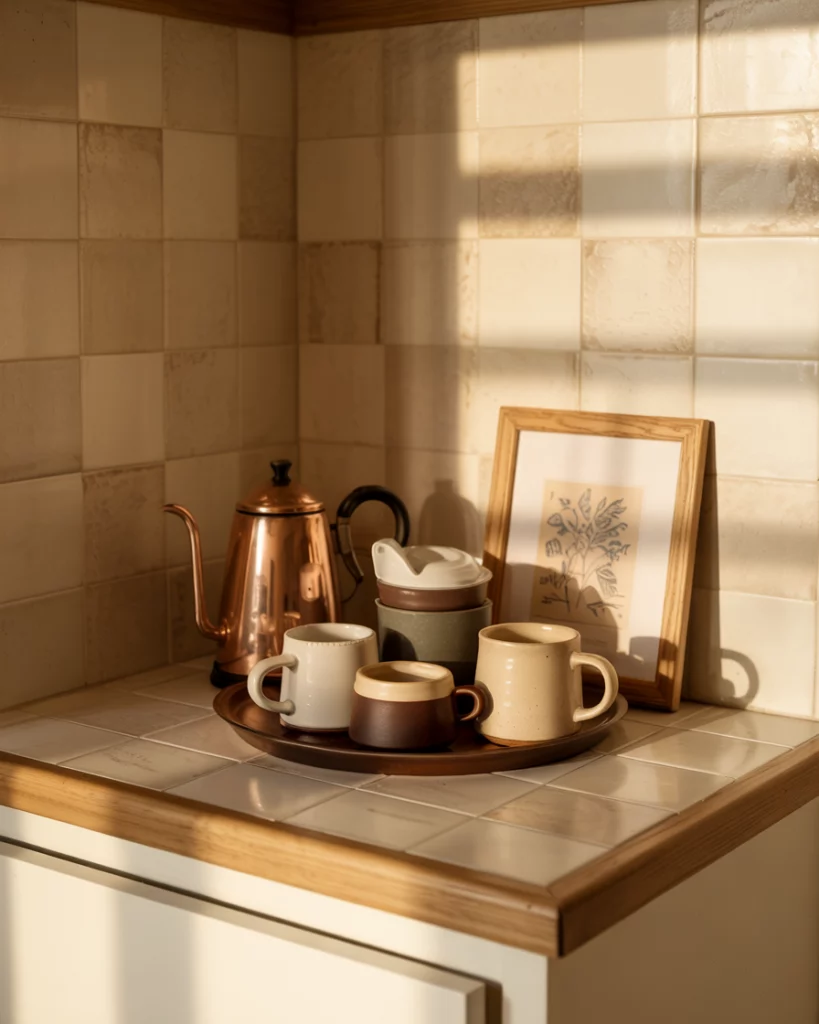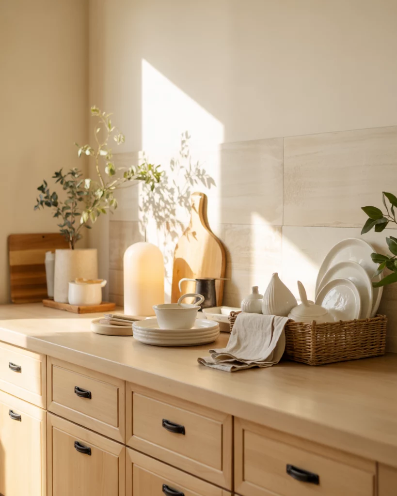 A bright morning counter setup keeps the kitchen feeling open and peaceful. A few light ceramics, a small white tray, and a soft cloth create a gentle start to the day. Add one idea for countertop detail or a modest aesthetic accent to keep the look fresh without clutter. Practical insight—A light, uniform palette hides visual noise from everyday items like mugs or fruit. It’s a simple trick for keeping kitchens looking effortlessly tidy, even during busy mornings.