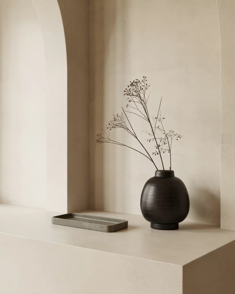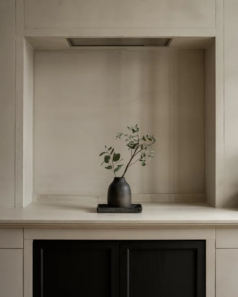 For kitchens craving definition, a streamlined setup in deep tones can be stunning. Pair a slim vase, a sculptural bowl, and one bold black accent for contrast. This look fits beautifully in open-plan homes where minimalist styling helps counters stay calm and a bit aesthetic without feeling stark. This minimal palette shines in smaller kitchens, where darker accents create depth without overpowering the footprint. It’s also ideal for renters seeking quick, low-effort styling that visually tightens a space.