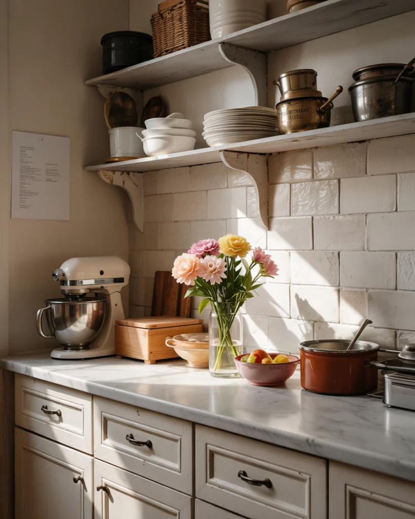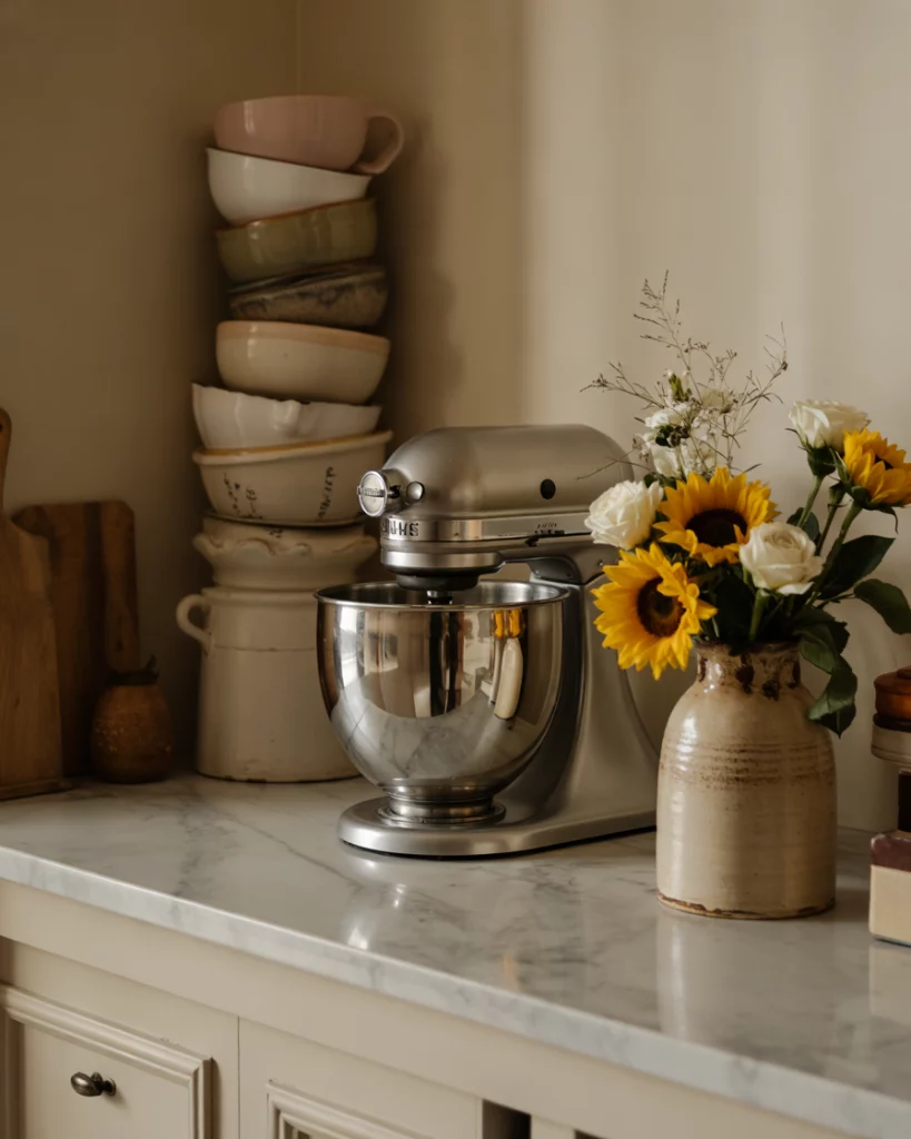 If you love warm, cinematic kitchens, this look channels that iconic Nancy Meyers vibe. Stacks of bowls, a vase of flowers, and a classic KitchenAid mixer set the tone. A few accessories arranged casually make the space feel charmingly lived-in but not cluttered. Grouping items by function keeps this cinematic style grounded. Bowls near prep zones, flowers near the sink, and mixers within reach ensure pretty things still support daily use.
