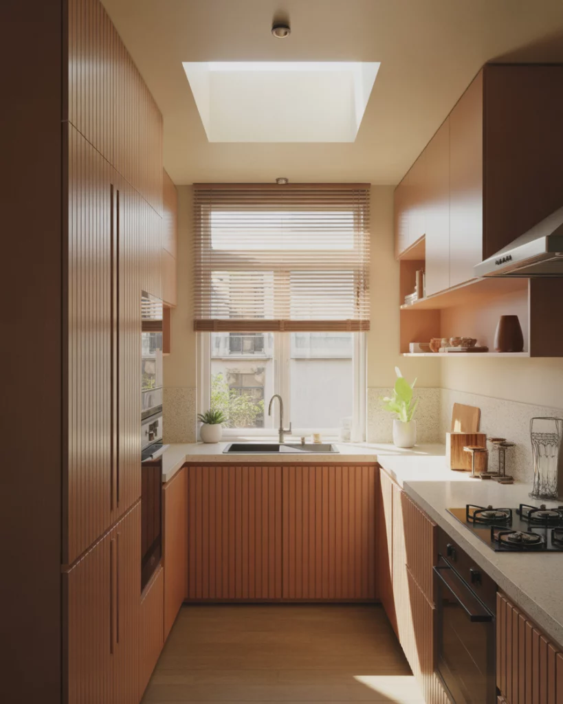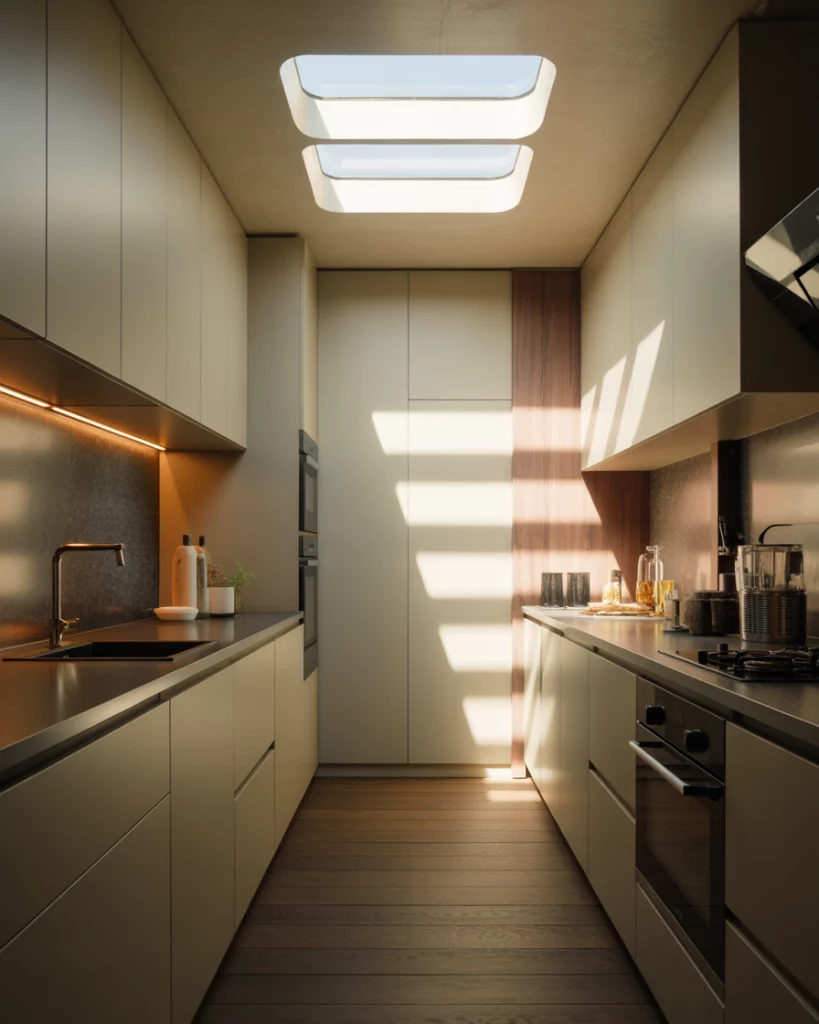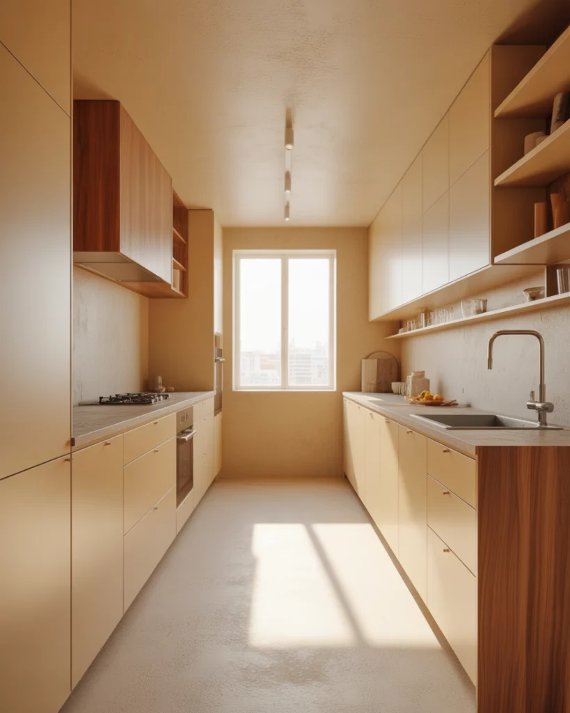 A refreshed galley brings clarity and structure to tight footprints, common in many urban apartments. Adding touches like a compact small galley storage tower, a petite corner stove, or slender pull-outs lets the space perform at full capacity. The key is balancing warmth and efficiency so the corridor feels purposeful, not restrictive. Real homeowner behavior shows that galleys shine when clutter is minimized daily. People with these kitchens often rely on routine resets—clearing surfaces, storing tools immediately, and reserving upper shelves for go-to items—which keeps the narrow corridor feeling surprisingly open.