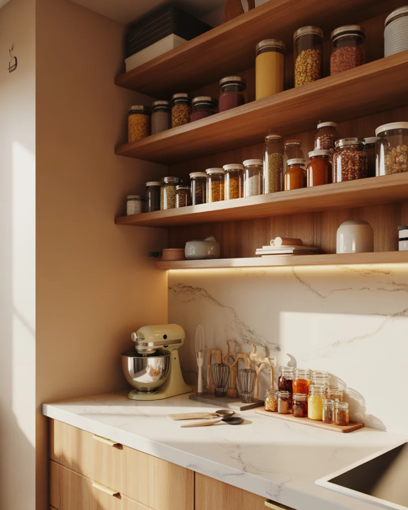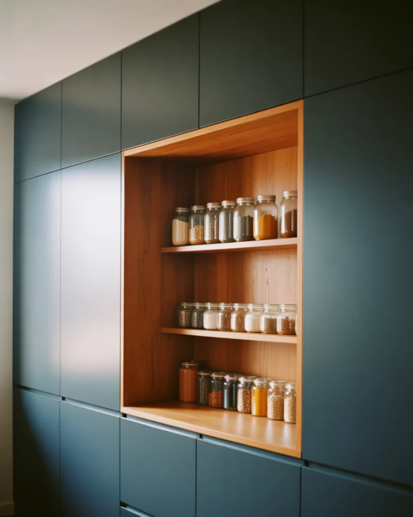The layout gains both beauty and functionality with the addition of the pantry niche. It can be integrated either in a wall recess or tucked in a small space near the fridge, creating a moment of rhythm in the layout. Keeping the design of the pantry dish and the rest of the kitchen cohesive will prevent it from standing out. In the American lifestyle, this pantry dish becomes valuable, as many households are accustomed to bulky and seasonal ingredient purchases. It will assist in the performing of weekly kitchen workflows, as it provides easy access to pantry staples while negating the need for large kitchen space.