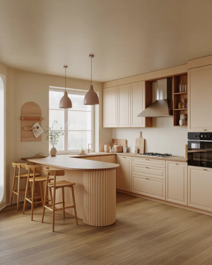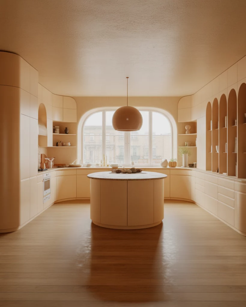 A curved island layout softens the kitchen’s geometry, making movement feel natural and inviting. It works beautifully in open spaces where a gentle arc encourages conversation. Pairing subtle curves with features like a sculpted design, thoughtful ideas, or refined material choices creates a setting that feels welcoming without losing function. Practical insight: curved islands reduce collision points in busy kitchens, offering smoother circulation and safer prep zones. This is particularly helpful for households where multiple people move through the space at the same time.