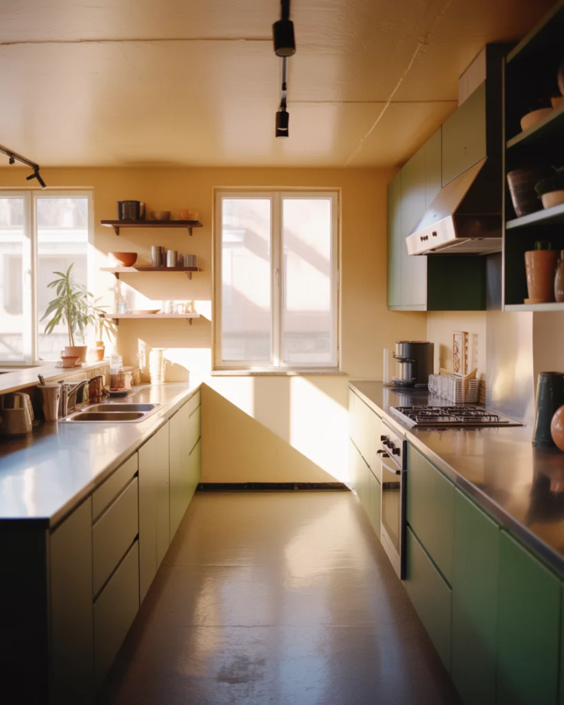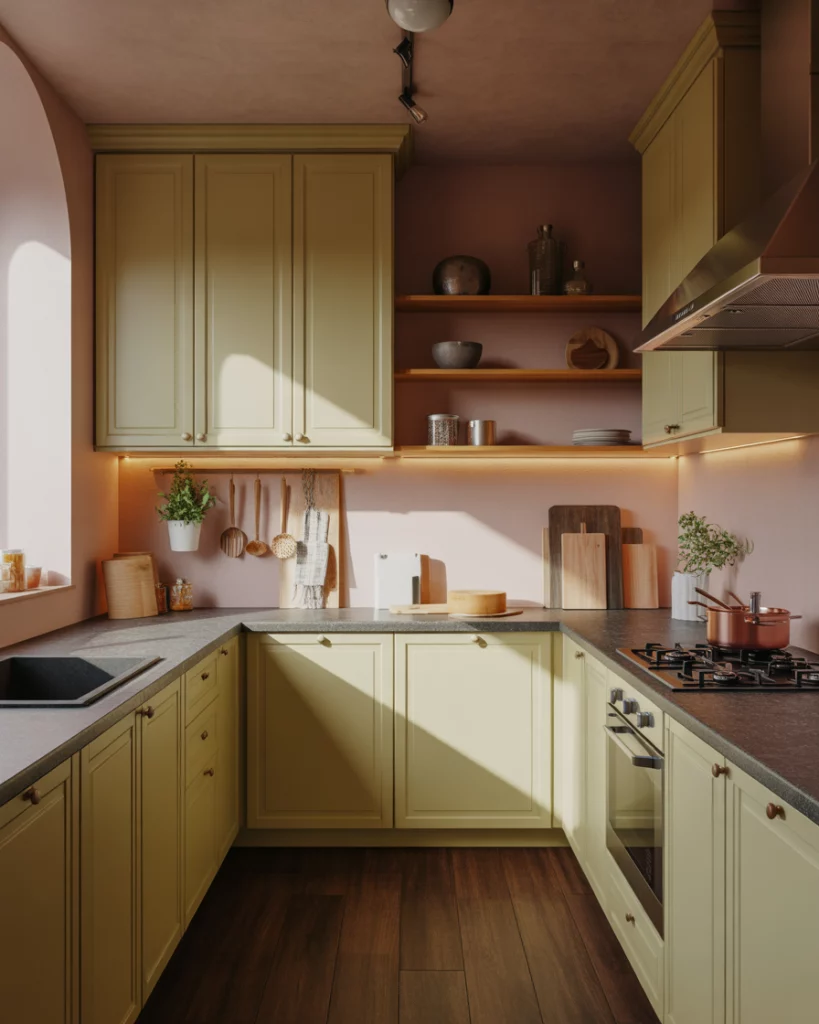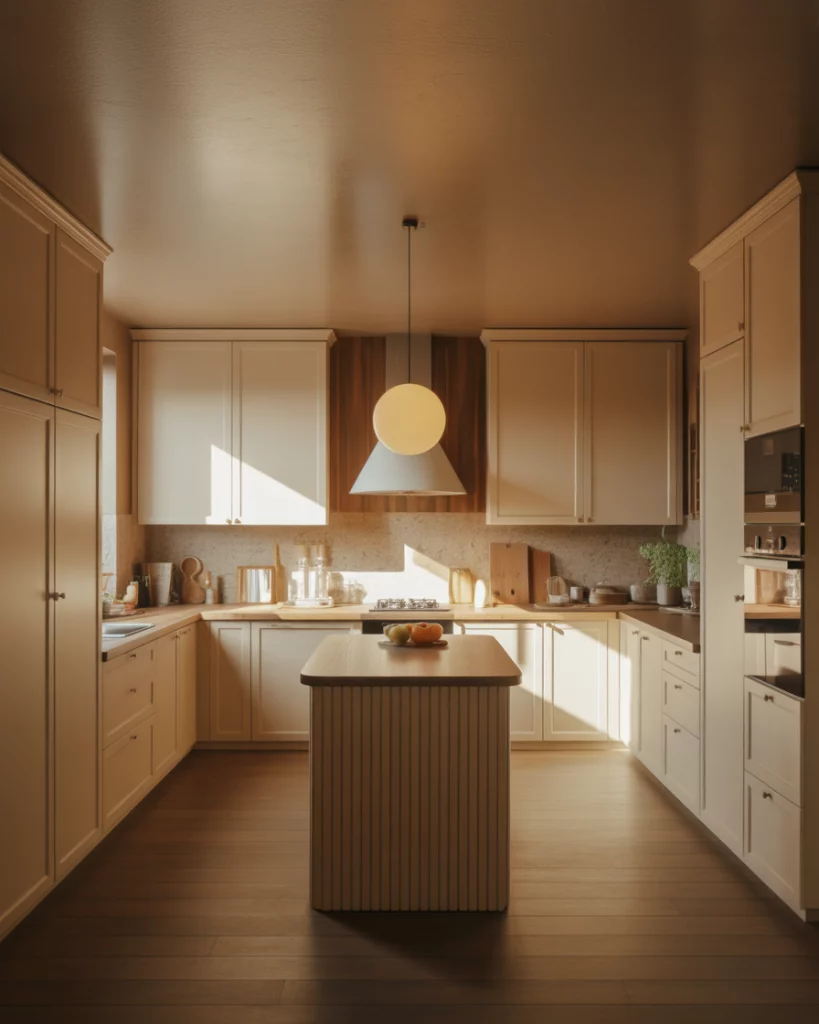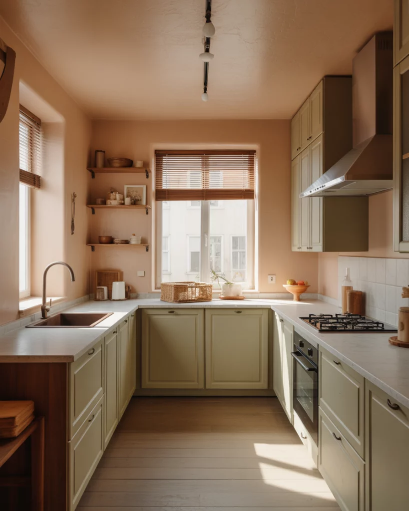 A U-shaped plan allows everything to sit within reach, creating an intuitive workflow. It suits medium-sized homes where maximizing prep and storage matters. Adding touches like flexible plans, a compact corner sink, or layered lighting ensures the shape feels grounded while still allowing plenty of breathing room. American lifestyle context: many suburban homes rely on U-shaped kitchens because they separate cooking, cleanup, and storage zones naturally. The setup also supports multitasking, from morning meal prep to supervising homework at the counter.