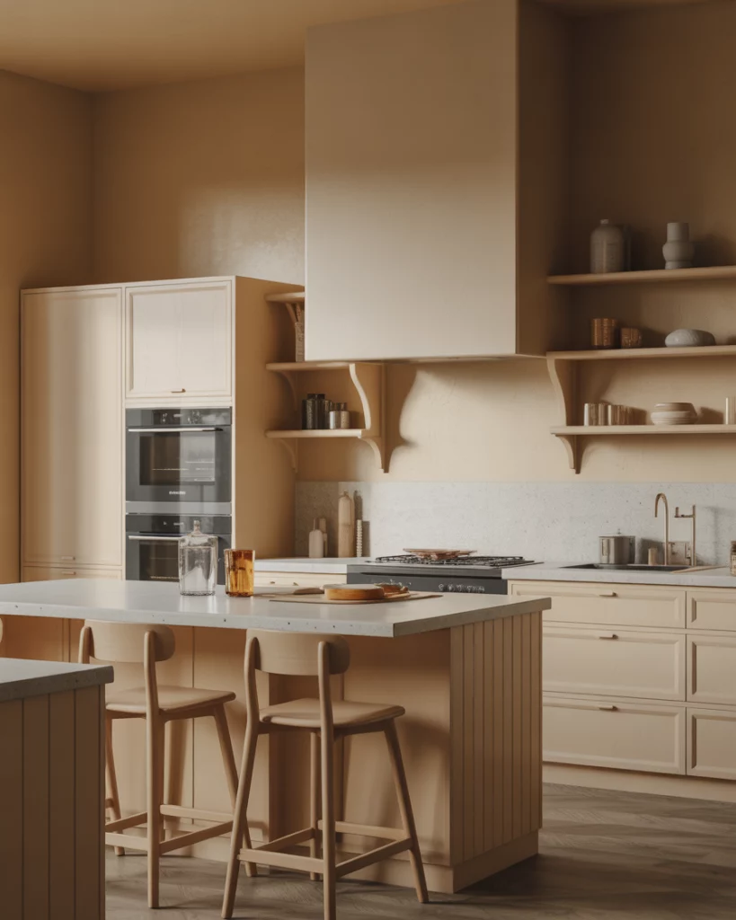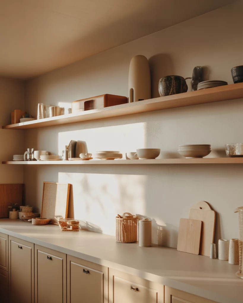 A kitchen that leans on open shelves creates a sense of height and airiness. It suits both modern and cottage styles where display meets function. Pairing shelves with elements like tailored wall arrangements, curated ideas, or subtle textures ensures the look feels intentional, not cluttered. Real homeowner behavior: people with open shelving tend to keep only everyday essentials within reach. This encourages consistent tidiness and avoids the common trap of over-decorating shelves with items that don’t get used.