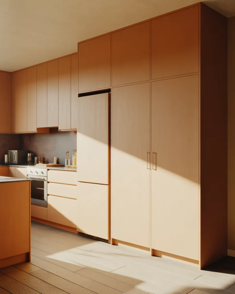 A concealed utility wall lets the rest of the kitchen shine. With panel-front appliances, integrated storage nooks, and minimal seams, the room feels crisp and uncluttered. Features like refined types of built-ins or hidden plans strengthen this understated design approach. Where it works best: modern homes and condos that value visual quiet. Hidden storage ensures daily necessities stay reachable while preserving a serene, gallery-like façade across the main working wall.