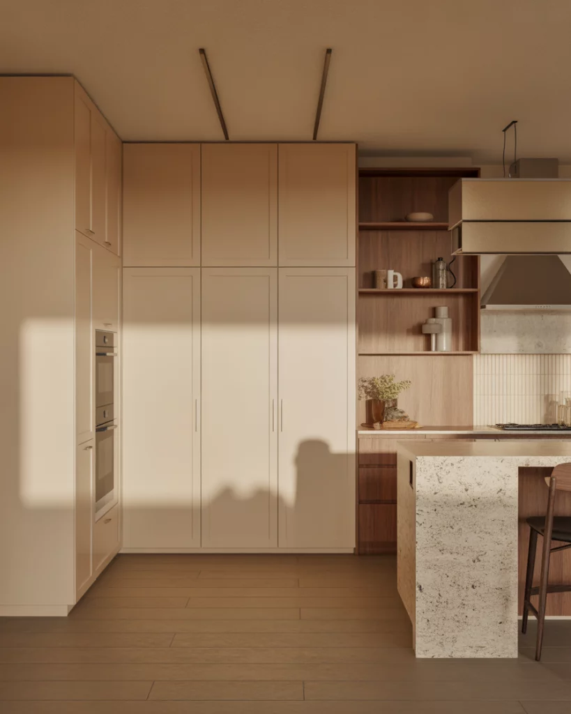 A full-height storage wall paired with a central island creates a powerful blend of order and accessibility. It works well in both large and medium kitchens. Using structured plans, defined island features, or textured cabinet doors keeps the layout warm while adding major functionality. Where it works best: homes that juggle cooking, storage, and hosting. The storage wall handles gear and groceries, while the island takes on prep and gathering duties, keeping the entire workflow straightforward and elegant.