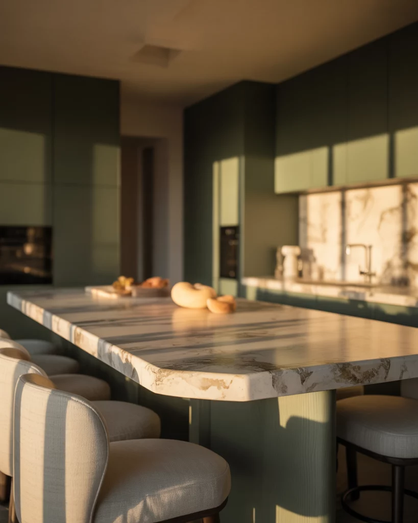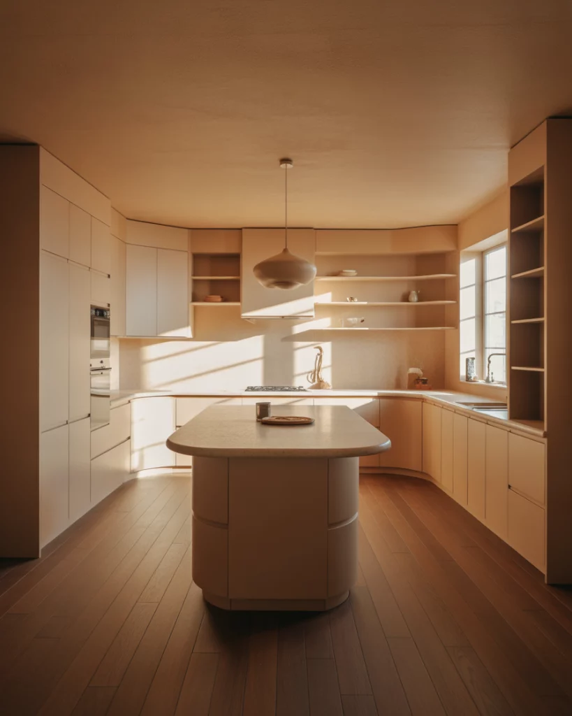 A curved island layout softens the kitchen’s geometry, making movement feel natural and inviting. It works beautifully in open spaces where a gentle arc encourages conversation. Pairing subtle curves with features like a sculpted design, thoughtful ideas, or refined material choices creates a setting that feels welcoming without losing function. Practical insight: curved islands reduce collision points in busy kitchens, offering smoother circulation and safer prep zones. This is particularly helpful for households where multiple people move through the space at the same time.