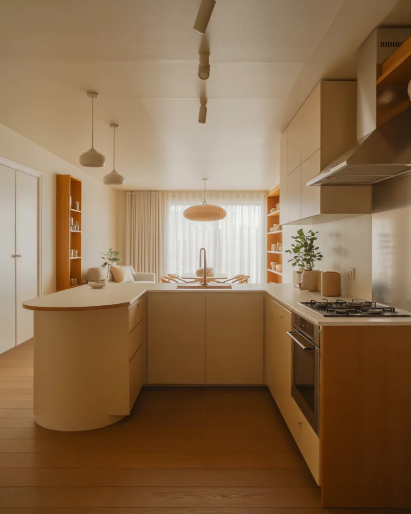 A U-shaped plan allows everything to sit within reach, creating an intuitive workflow. It suits medium-sized homes where maximizing prep and storage matters. Adding touches like flexible plans, a compact corner sink, or layered lighting ensures the shape feels grounded while still allowing plenty of breathing room. American lifestyle context: many suburban homes rely on U-shaped kitchens because they separate cooking, cleanup, and storage zones naturally. The setup also supports multitasking, from morning meal prep to supervising homework at the counter.