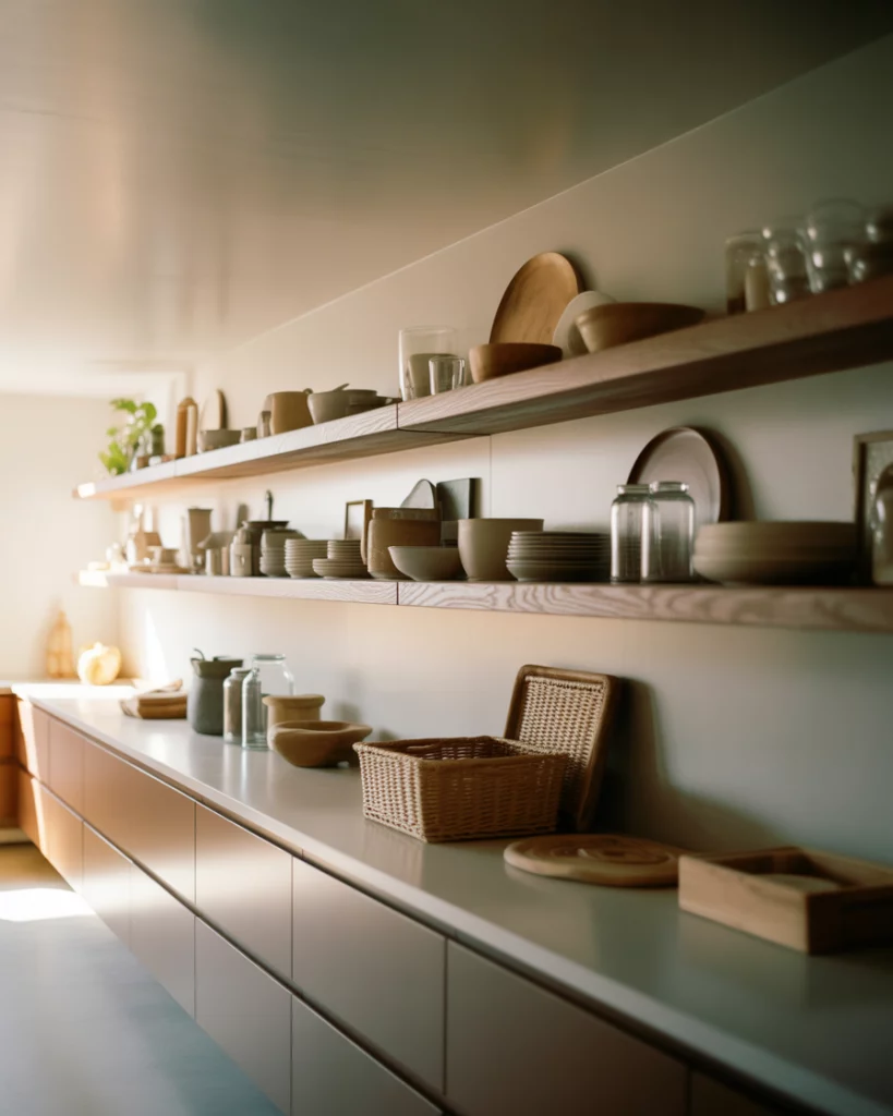 A kitchen that leans on open shelves creates a sense of height and airiness. It suits both modern and cottage styles where display meets function. Pairing shelves with elements like tailored wall arrangements, curated ideas, or subtle textures ensures the look feels intentional, not cluttered. Real homeowner behavior: people with open shelving tend to keep only everyday essentials within reach. This encourages consistent tidiness and avoids the common trap of over-decorating shelves with items that don’t get used.