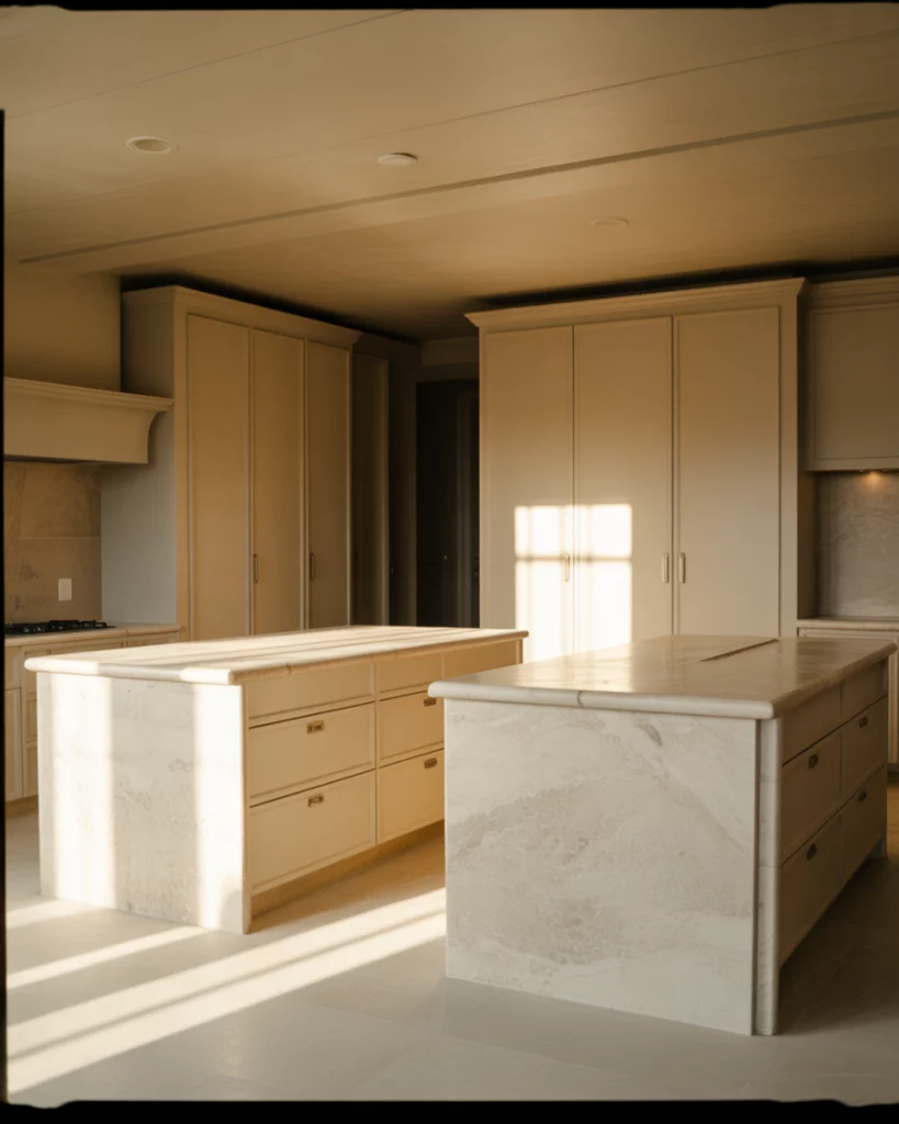 For larger homes, double islands create a striking sculptural effect. Pairing bold surfaces, flexible double island zones, or choreography with island floorplan moves elevates both workflow and drama. This setup suits cooks who love defined zones—one for prep, one for plating or conversation—without compromising spaciousness. Common mistakes to avoid: making aisles too tight, choosing oversized islands, or mismatching materials between them. Proper spacing ensures fluid movement and prevents the room from feeling like a showroom—double islands need breathing room to feel intentional rather than excessive.