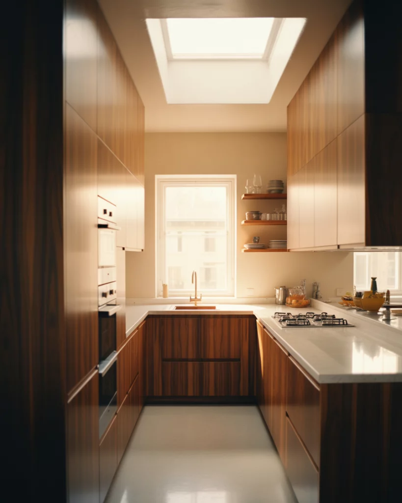 A refreshed galley brings clarity and structure to tight footprints, common in many urban apartments. Adding touches like a compact small galley storage tower, a petite corner stove, or slender pull-outs lets the space perform at full capacity. The key is balancing warmth and efficiency so the corridor feels purposeful, not restrictive. Real homeowner behavior shows that galleys shine when clutter is minimized daily. People with these kitchens often rely on routine resets—clearing surfaces, storing tools immediately, and reserving upper shelves for go-to items—which keeps the narrow corridor feeling surprisingly open.