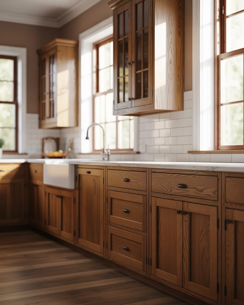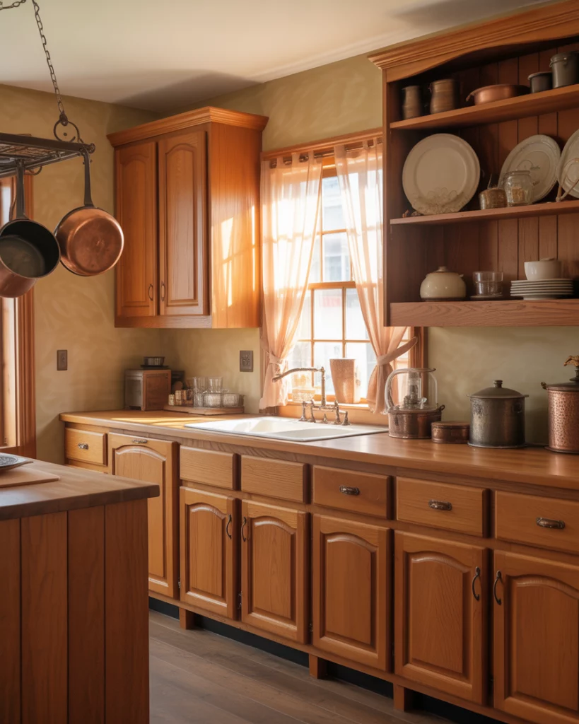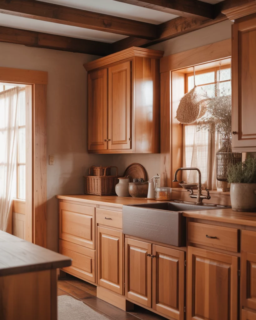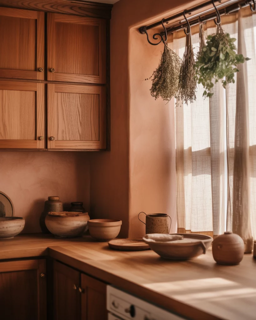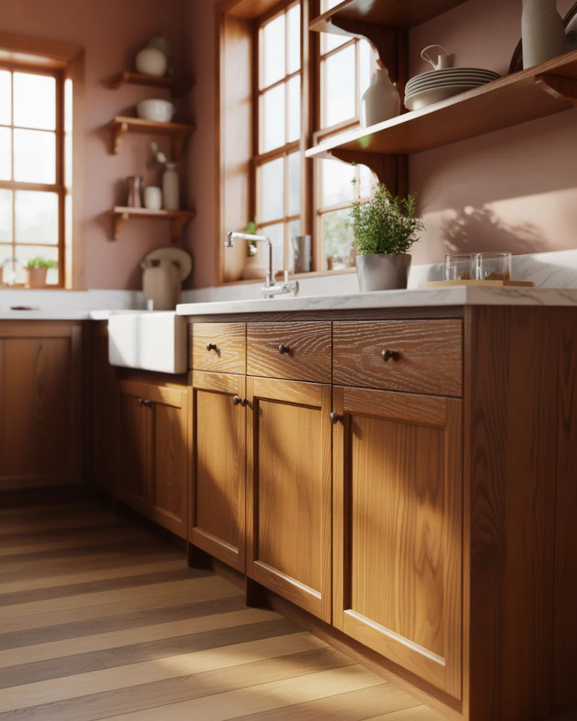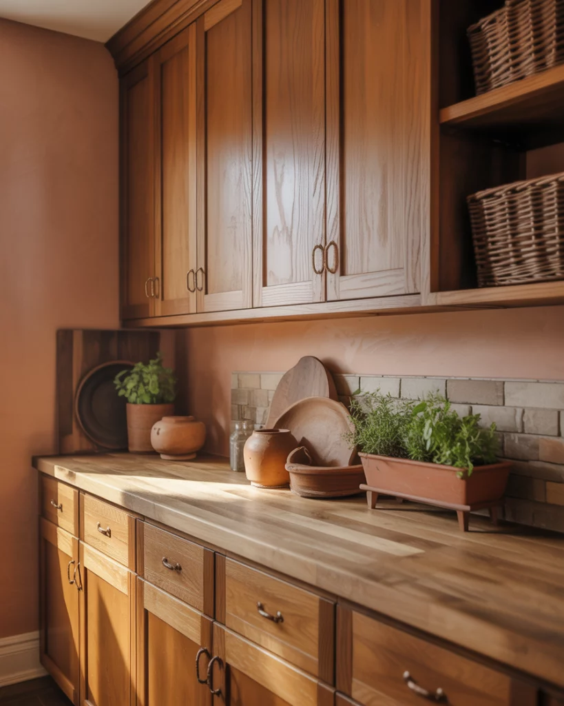 11. Soft Clay Walls with Oak Cabinets for Earthy Warmth