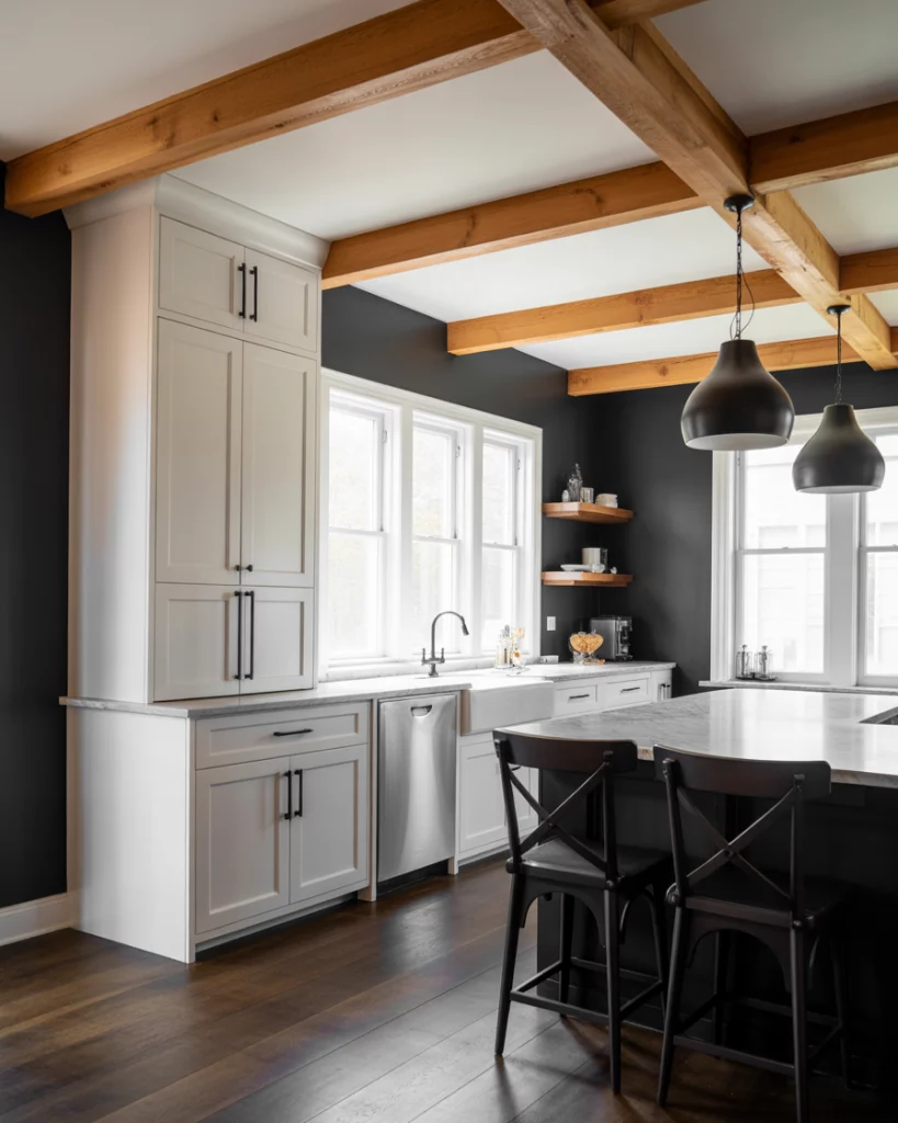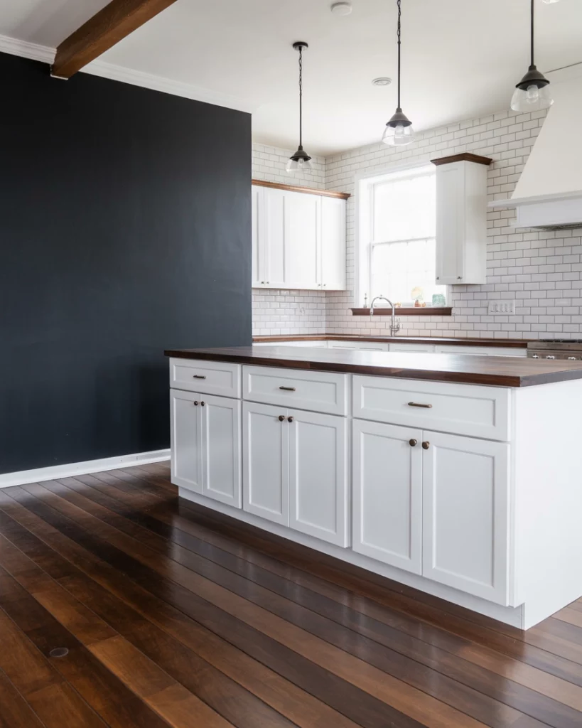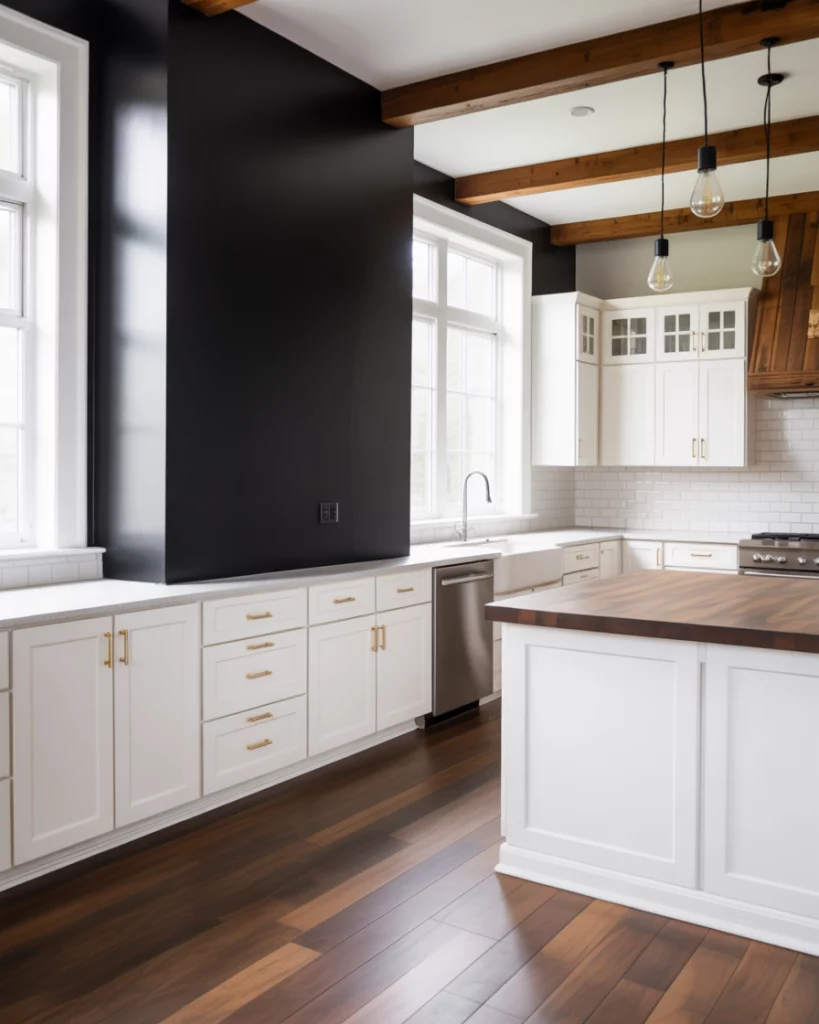 10. Matte Black Accent Walls with White Cabinets and Dark Wood Floors