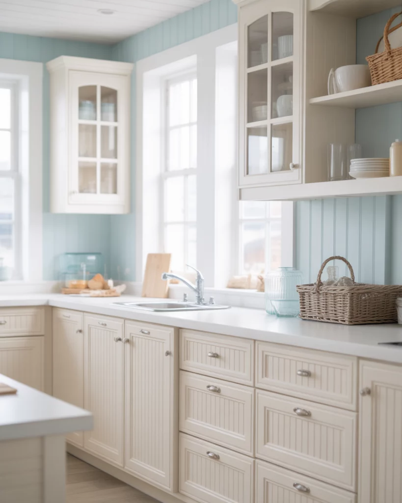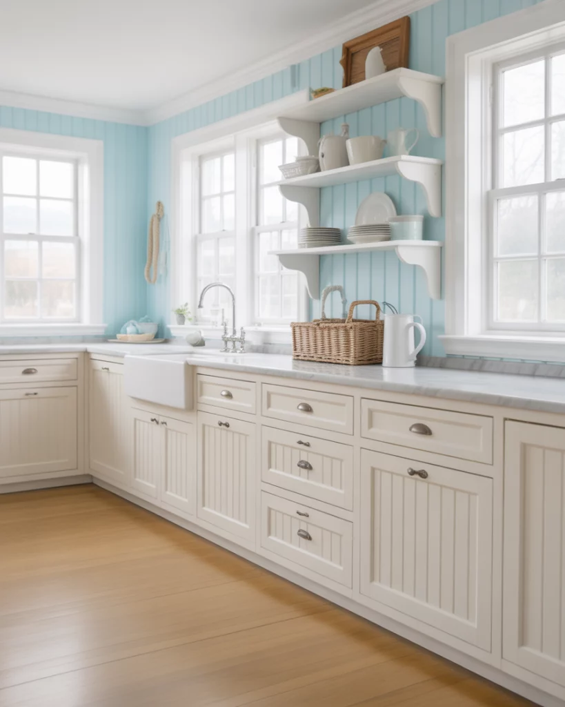 Pairing white cabinets with a pale sky-blue wall instantly lightens the mood, creating an airy, cheerful setting reminiscent of coastal cottage kitchens. The soft blue contrasts beautifully with bright white while remaining subtle enough to work in city apartments and suburban homes alike. Sherwin-Williams forecasts that serene pastels will return in 2026, reflecting calm and optimism—something every busy kitchen could use.