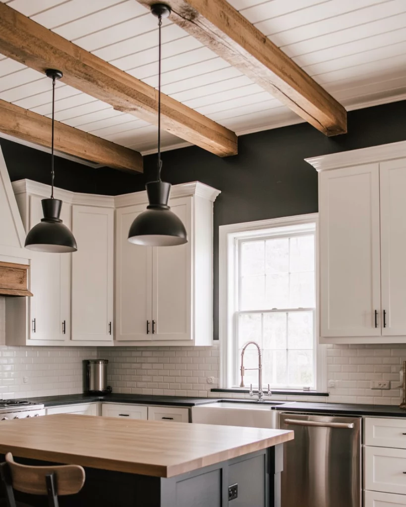 In a modern farmhouse kitchen, deep neutral shades such as charcoal gray create dramatic sophistication without overpowering natural texture. Side-by-side with white cabinets or reclaimed wood cabinets, charcoal walls create instant contrast with visual grounding. The aesthetic is sophisticatedly chic yet comfortable—consider matte finishes, black iron fittings, and rough-hewn tables beneath pendant lighting. It’s one of the top schemes for those blending traditional with modern design.