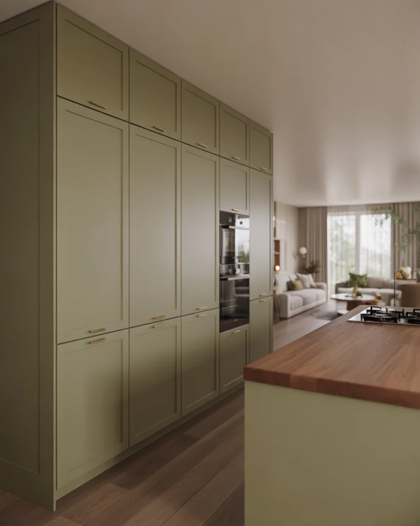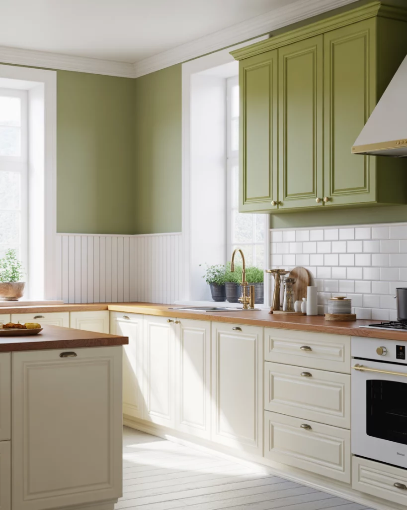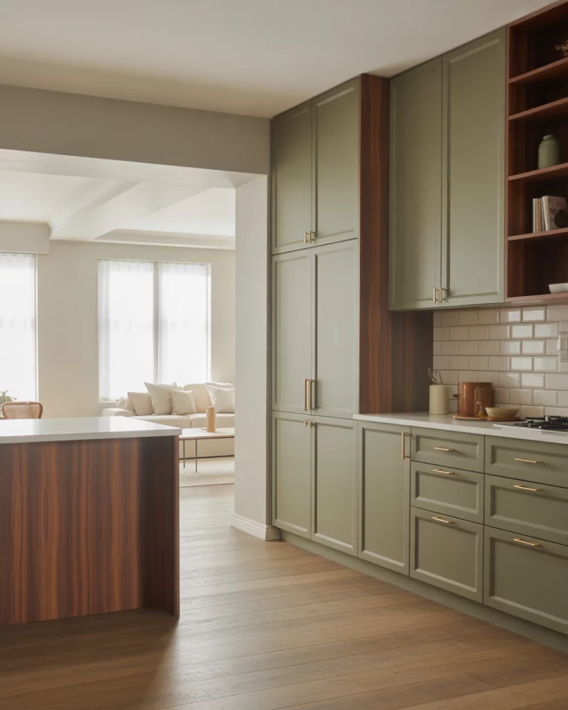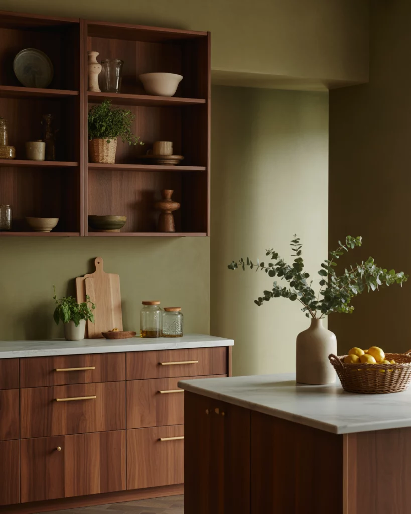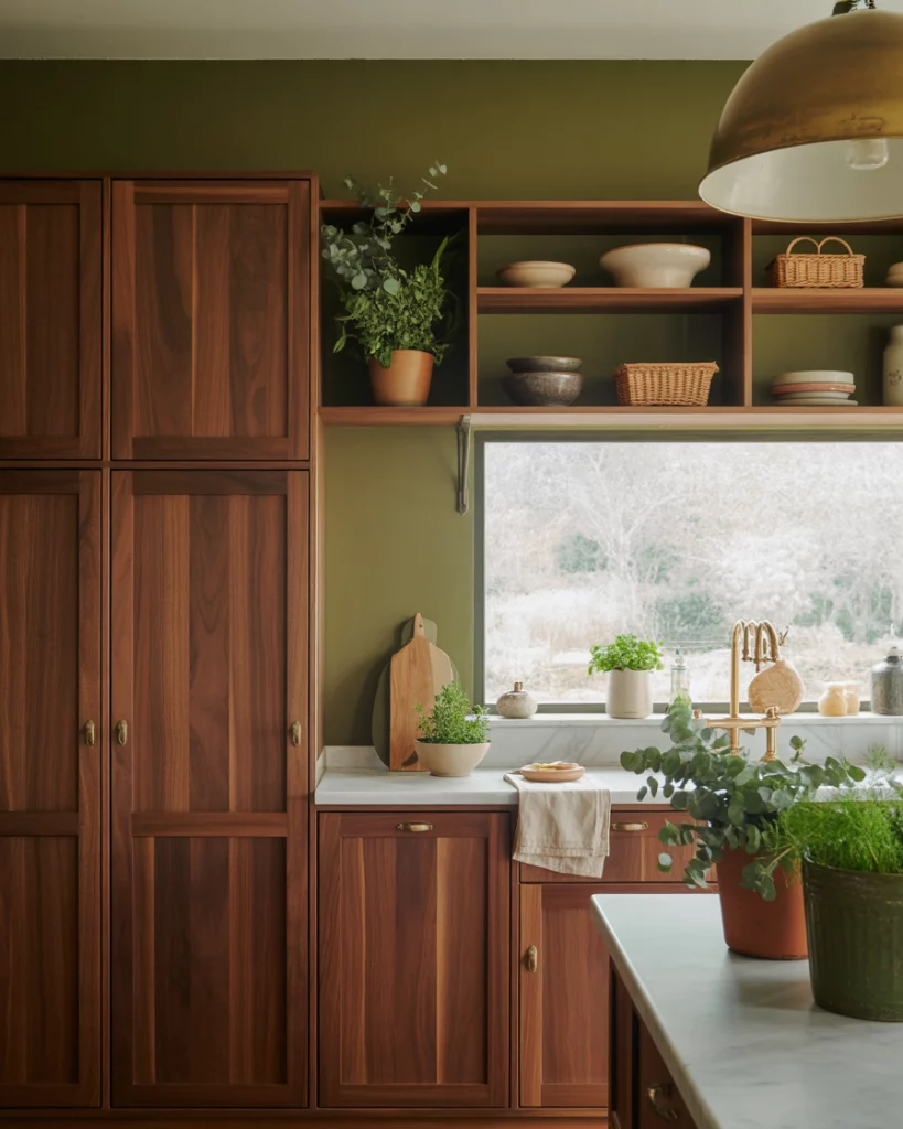Moody olive-green wall color adds sophisticated personality when paired with wood cabinets in any shade—light oak through dark walnut. Olive contributes a sense of calm energy while retaining richness and depth. In 2026 design trends, designers highlight this “nature-infused luxury” as a transition from country to modern looks. It feels earthy and grounded with effortless chicness.