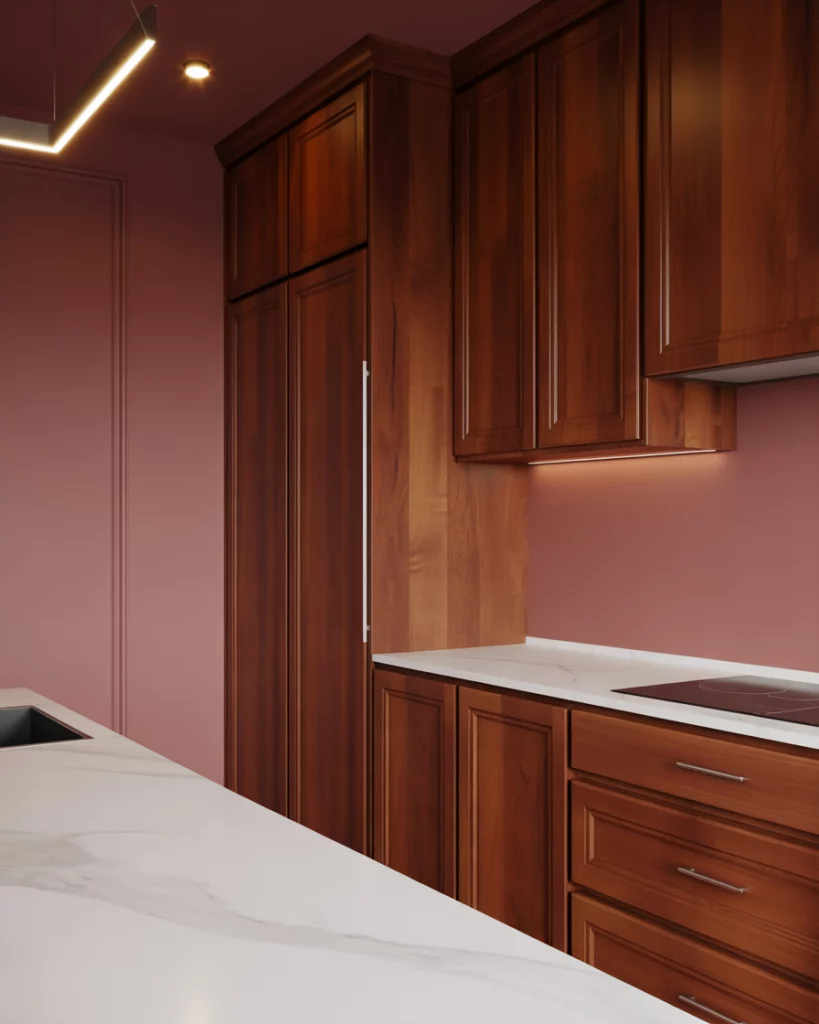16. Dusty Rose Walls Paired with Cherry Cabinets