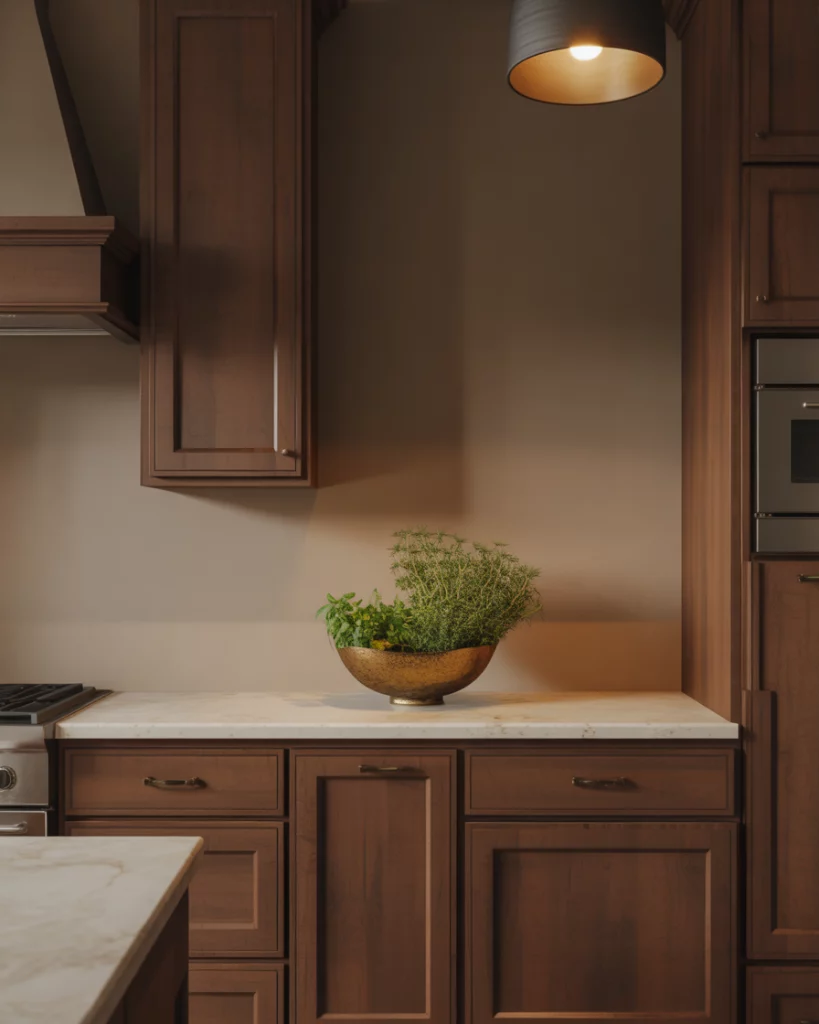 If you have brown cabinets in your kitchen, you may want to consider a mushroom-gray wall color—a balance of beige and gray—to update the appearance while keeping it warm and neutral. The color adds elegance and still makes the wood’s natural richness shine through. Sherwin-Williams designers frequently suggest mushroom grays in 2026 offerings as part of a home seeking a serene, underplayed luxury sophistication.