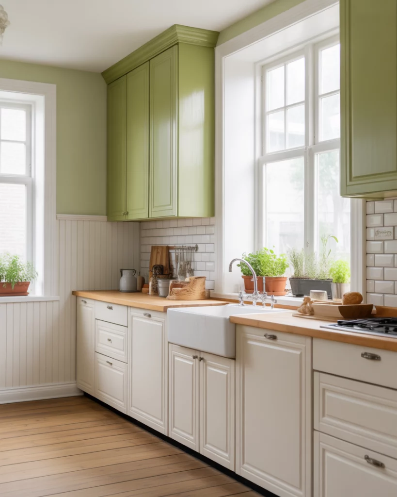 An eye-catching 2026 combination pairs green cabinets on the lower half with white or sage-tinged upper walls. The greens layered on top add natural energy without limiting the palette further. This two-tone concept is celebrated by designers at Benjamin Moore as one of the top concepts for walls that are balanced as well as zesty. It’s perfect for tiny kitchens seeking color without overpoweredness.