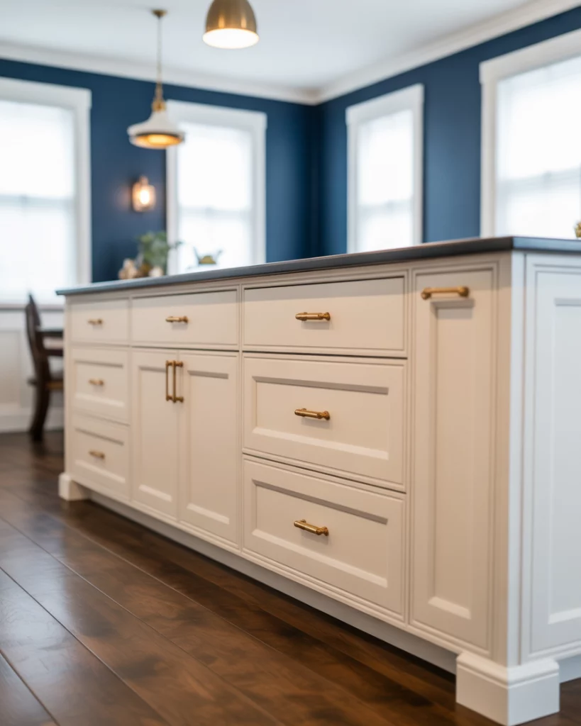 19. Classic Navy Walls with White Cabinets and Brass Accents