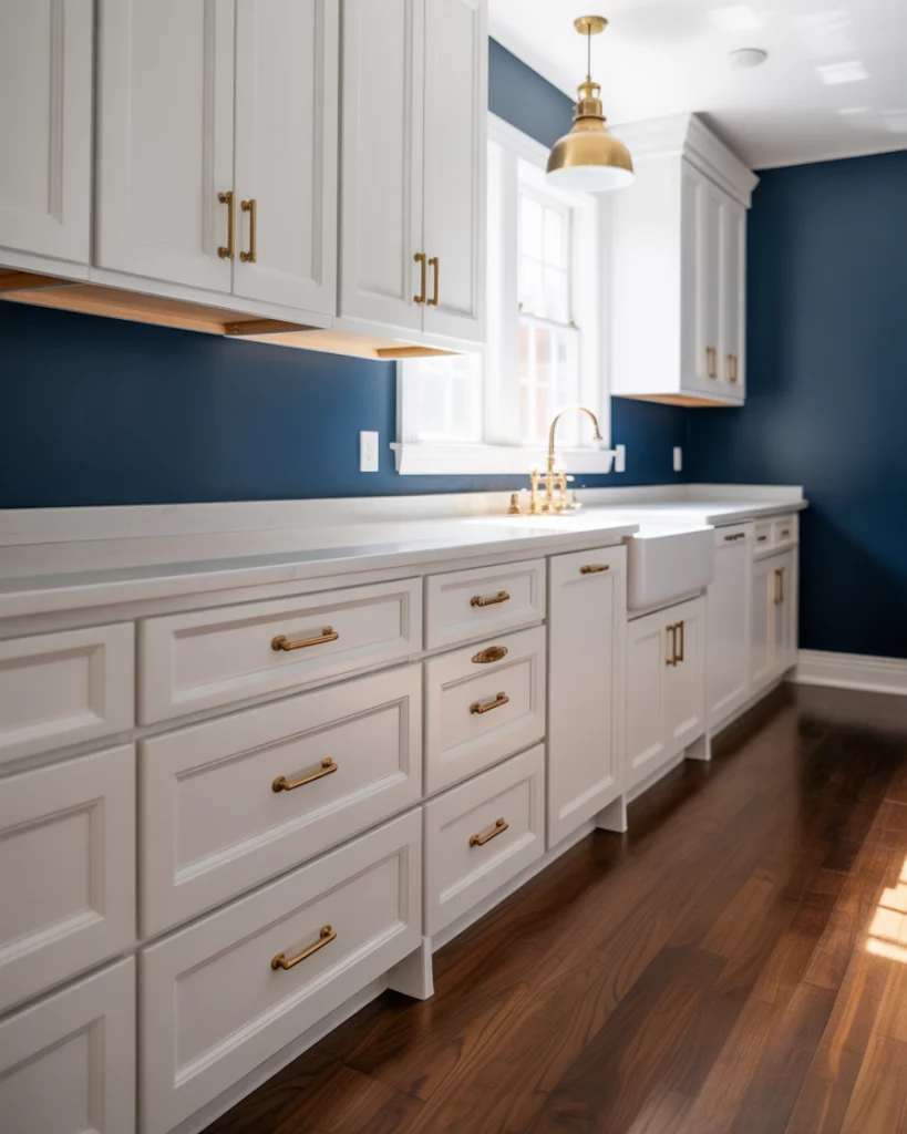 Classic navy walls are timeless, especially paired with white cabinets with gold or brass finishes. This combination feels sophisticated but bold, ideal for transition spaces that merge modern farmhouse and city chic. Navy looks fantastic with dark wood floors or butcher-block countertops, achieving deep contrast while remaining popular within 2026 designer schemes.
