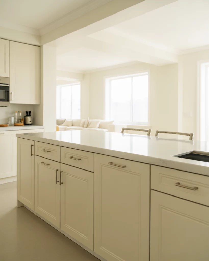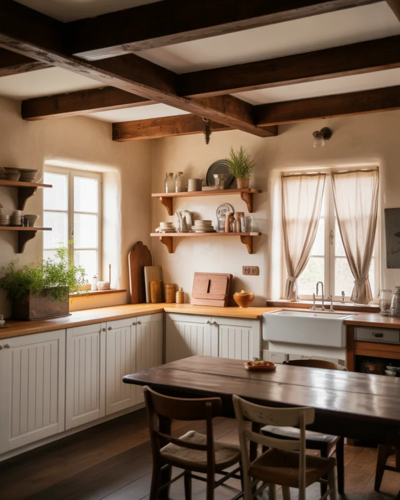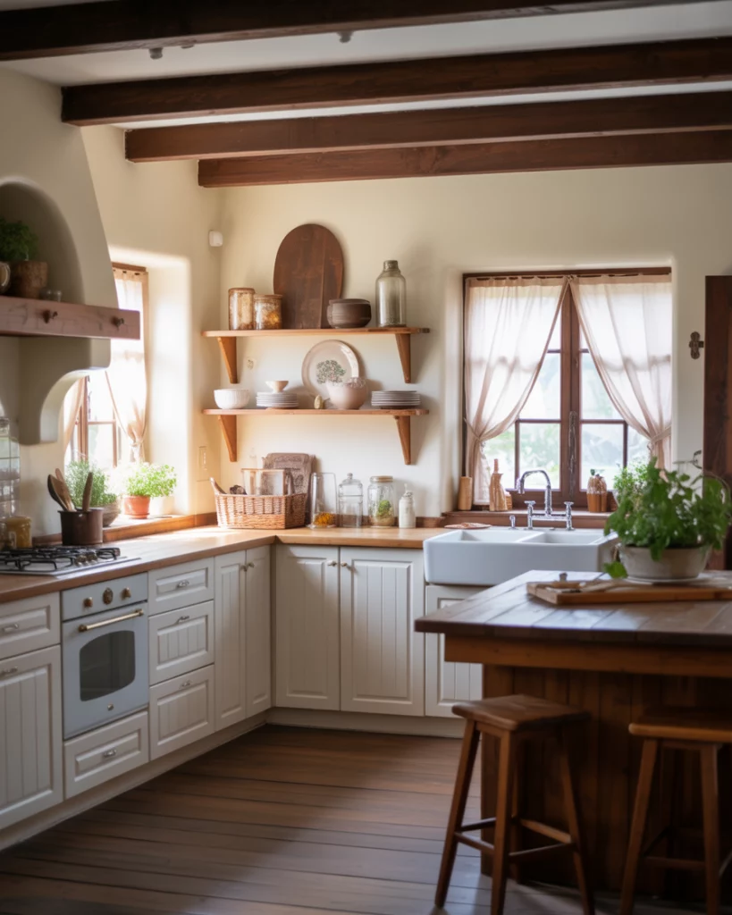 In a rustic or cottage-style kitchen with white cabinets, painting the walls a warm, creamy off-white (rather than pure white) gives a lived-in, welcoming feel. The off-white softens the brightness of the cabinetry and works harmoniously with wood beams, vintage lighting, shiplap, or open shelves. This is especially ideal if your kitchen connects visually to a living room or family space and you want cohesion across zones.