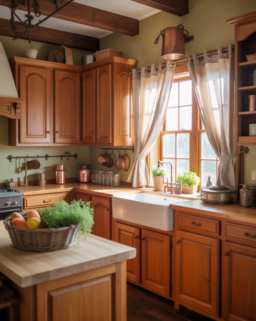 20. Sandstone Beige Walls with Oak Cabinets in Country Style