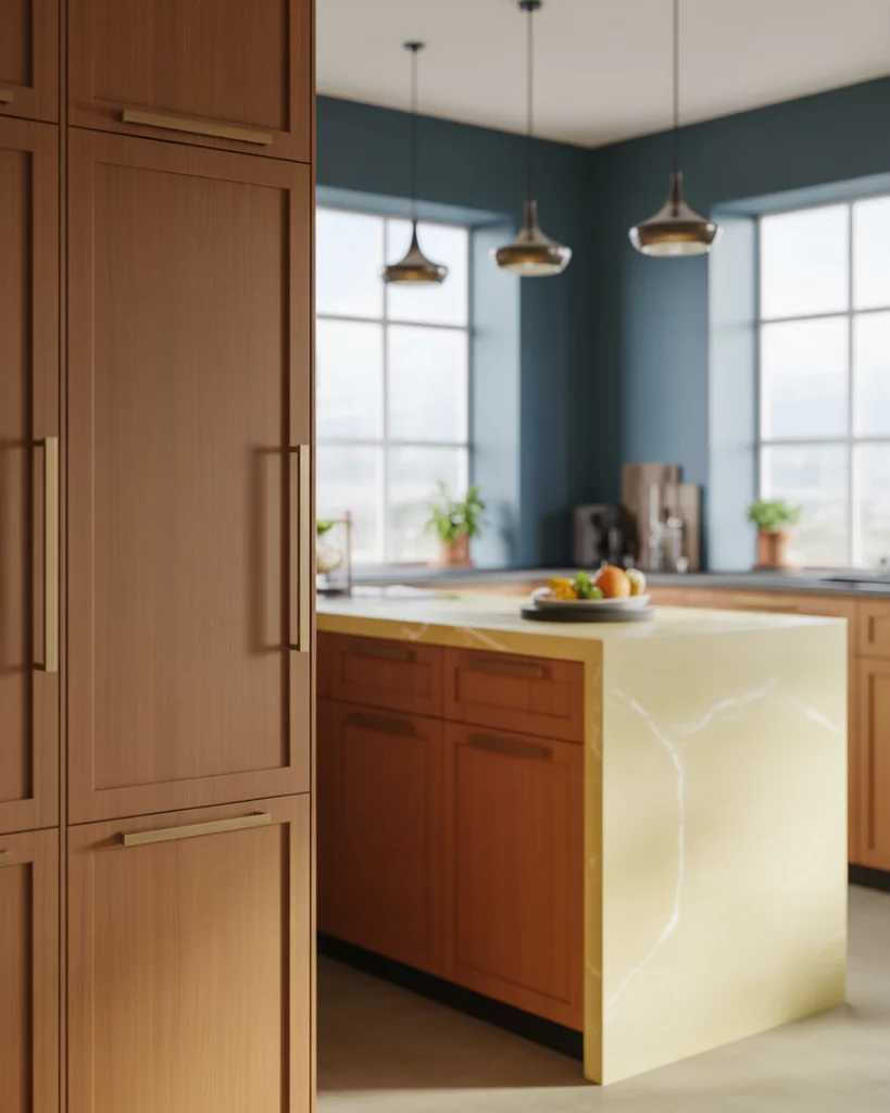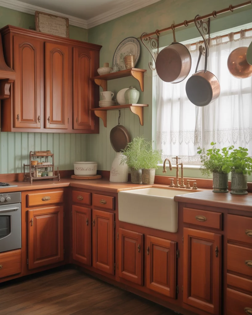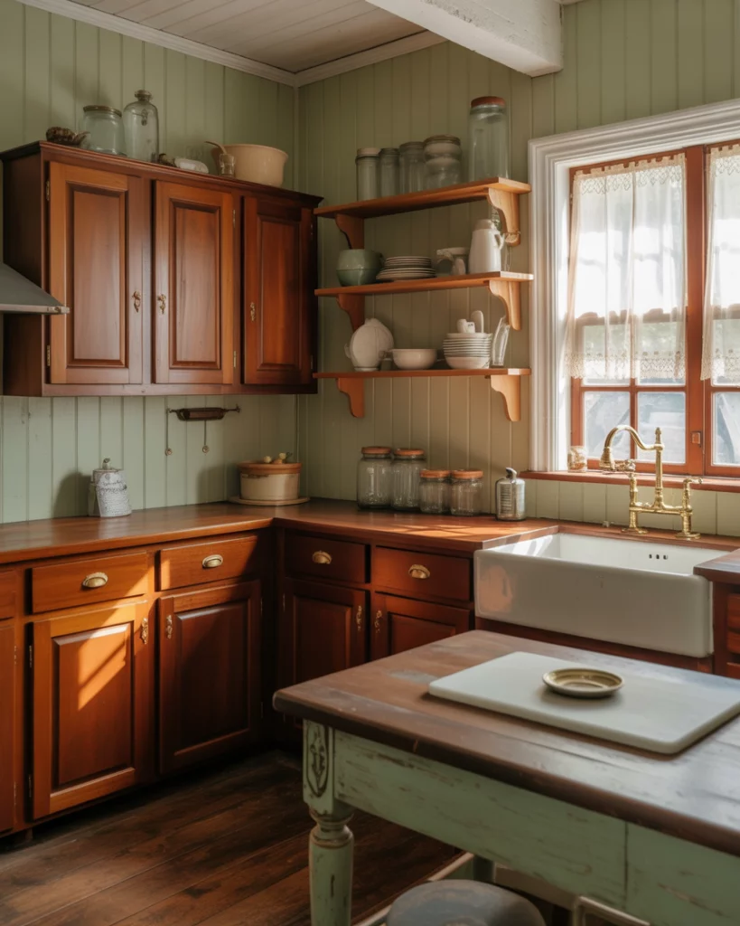 In a kitchen with cherry cabinetry—which frequently includes reddish-wood hues—a softer pastel wall color (such as faded aquamarine, sage-green, or light celery) provides a light, subtle contrast. It creates a light, airy atmosphere while also adding warmth and sophistication. This combination is particularly well-suited when you desire no hard contrast but you want color and character. The pastel phenomenon is coming back for 2026 in muted forms.