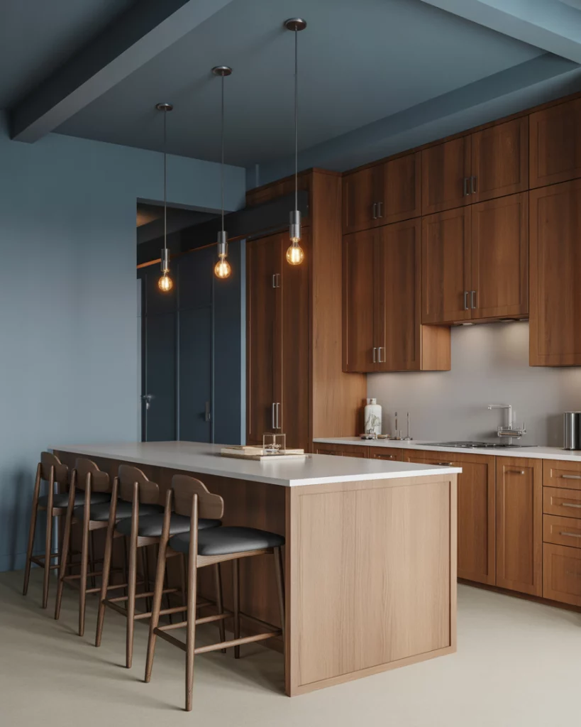 Smoky blue on a wall is a classic means of revamping kitchens with maple cabinets or oak cabinets. The slightly cool tone brings calm while pairing beautifully with warm wood. This pairing feels light but classy, perfect for open concepts that flow through to the living room space. Designers comment that smoky shades such as these are top concepts for 2026 wall painting due to them bringing balance with natural materials while aligning with modern design trends.